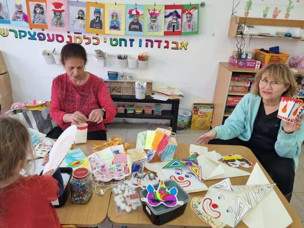 צוות המתנדבות העביר לילדי הגנים מגוון סדנאות להכנת מסיכות ססגוניות, ליצני בלונים מקרטונים מצוירים, אשר הוצמדו לליצן גדול ממדים, פרצופי ליצנים על גבי צלחות מקרטון, ליצנים שנצבעו ונתלו הפוך על קולבים וקופסאות למשלוחי מנות.
