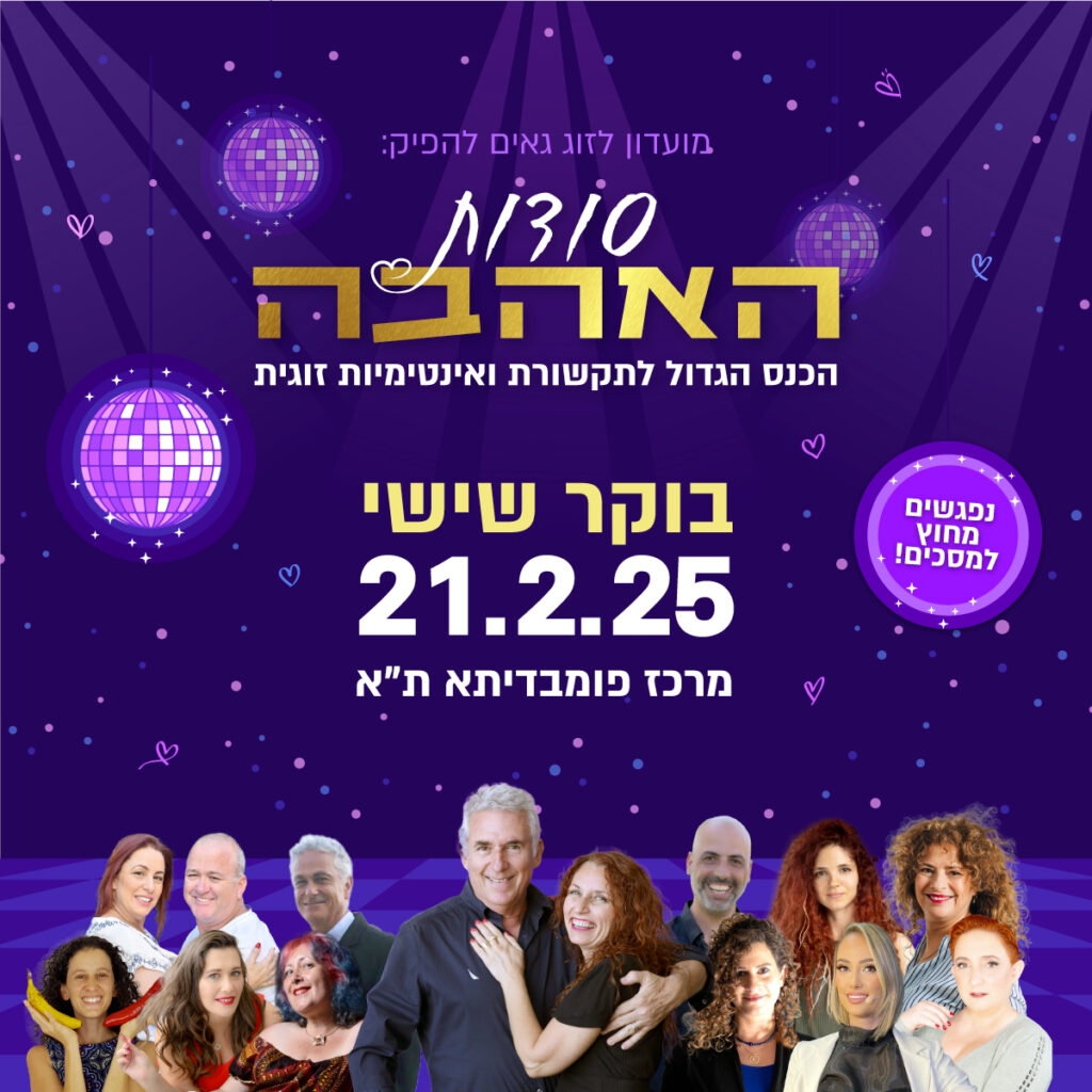 סודות האהבה – הכנס הגדול לתקשורת ואינטימיות זוגית יתקיים בבוקר שישי ה- 21.2 , בין השעות 8:30-14:30 במרכז פומבדיתא 8 בתל אביב ויכלול את ההרצאות הבאות: