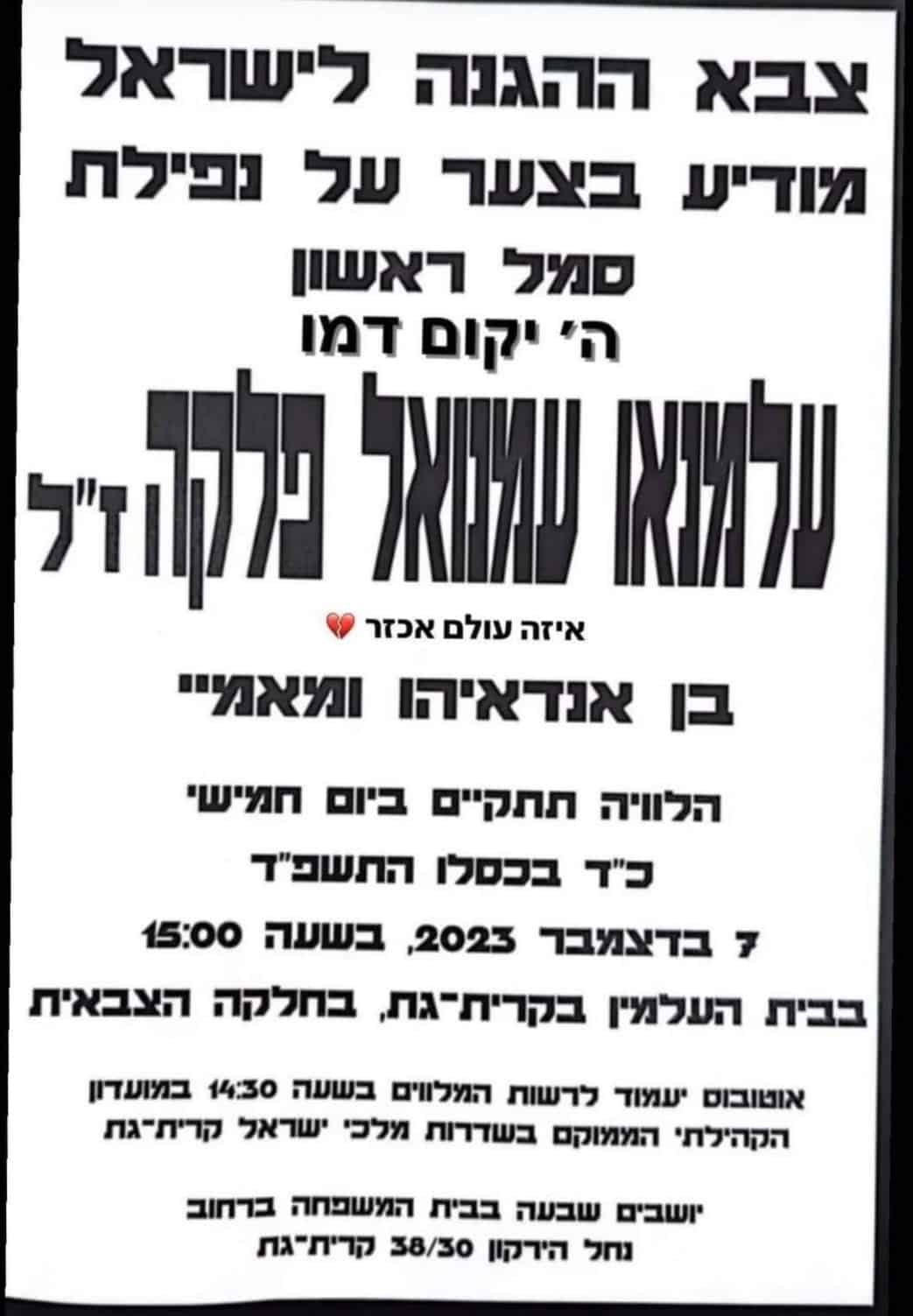 ההלווייה תתקיים היום יום חמישי כד' כסלו 7.12.23 בשעה 15:00 בחלקה הצבאית בבית העלמין בקרית גת.