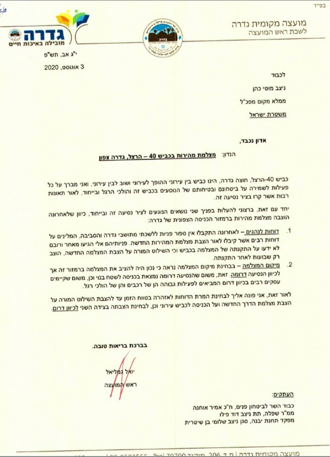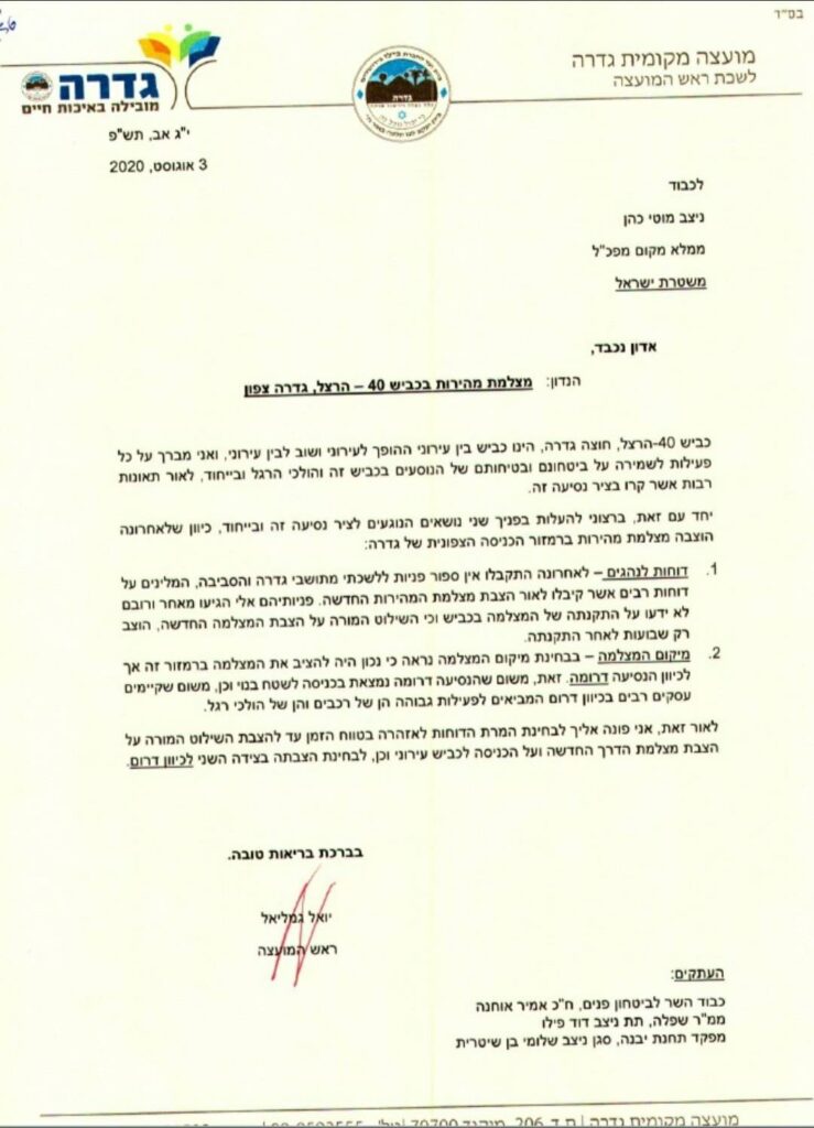 במכתב שנשלח שבוע שעבר לשר לבטחון פנים אמיר אוחנה,שרת התחבורה מרת מירי רגב, מ"מ מפכ"ל משטרת ישראל מוטי כהן, ציינו התושבים כי יש לבטל את הדוחות ממצלמה א-3 בכביש 40 גדרה והסדירו שילוט ותמרור ברורים בקטע כביש זה מצפון לדרום ומדרום לצפון. כאמור, בכביש 40, ישנו קטע שעובר סמוך לעיר גדרה, קטע זה הוגדר ככביש עירוני למרות שמדובר בכביש ראשי של המדינה ושרובו 3 ק"מ, זהו כביש רחב דו נתיבי לכל כיוון, עם שטח הפרדה.
