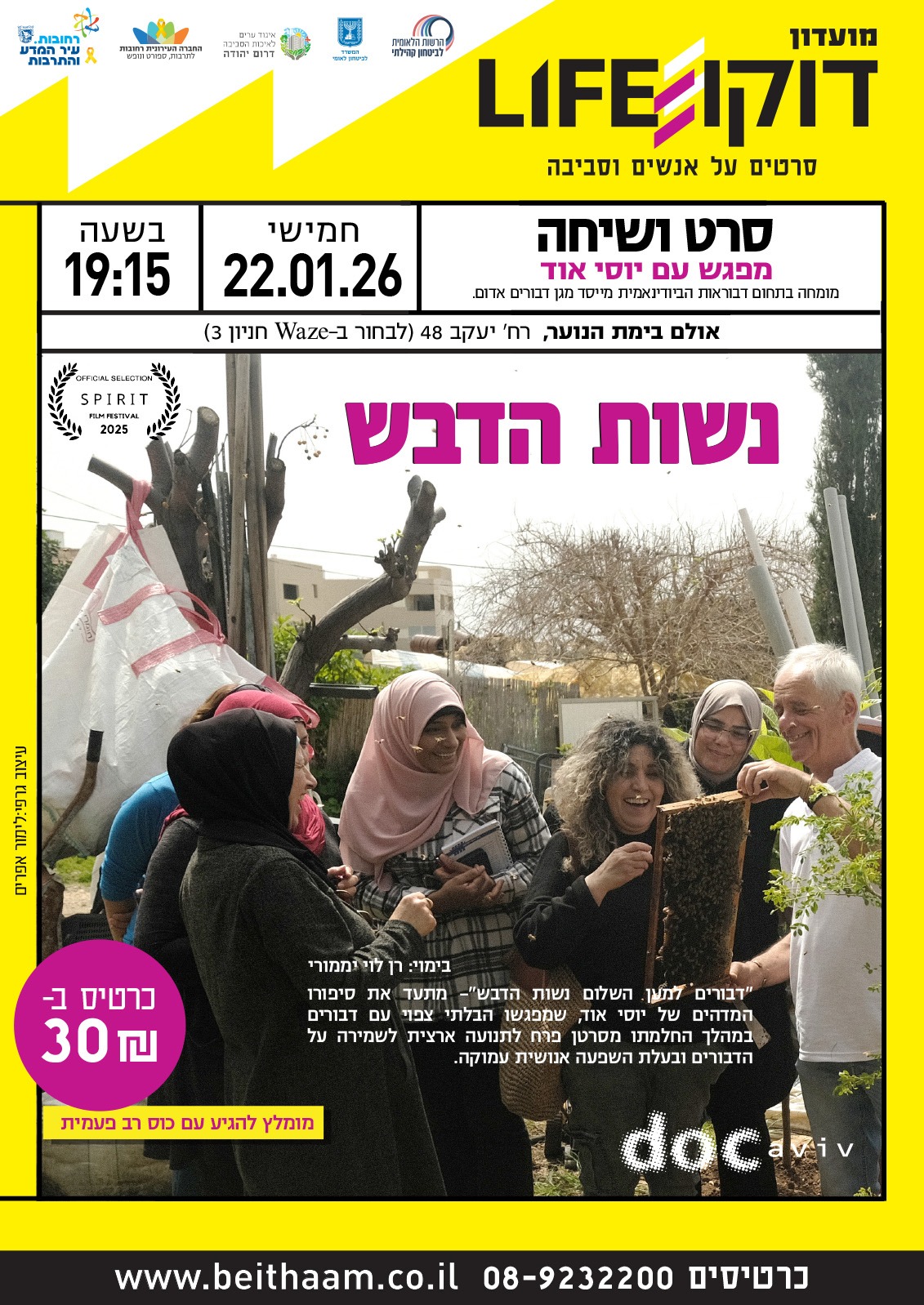 ביום חמישי, (22 בינואר), בשעה 19:15, יוצג באולם בימת הנוער ברחובות (רח' יעקב 48, מאחורי היכל התרבות) הסרט "נשות הדבש", בשילוב הרצאה מיוחדת של יוסי אוד, מומחה בדבוראות ביודינמית ומייסד "מגן דבורים אדום".