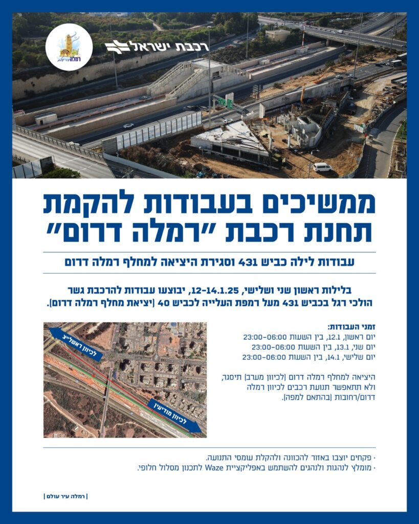 בלילות ראשון, שני ושלישי (12-14.1) תיסגר היציאה למחלף רמלה דרום (לכיוון מערב – לבאים מכיוון מודיעין לרמלה) בין השעות 23:00-06:00, במסגרת העבודות להקמת תחנת רמלה דרום.