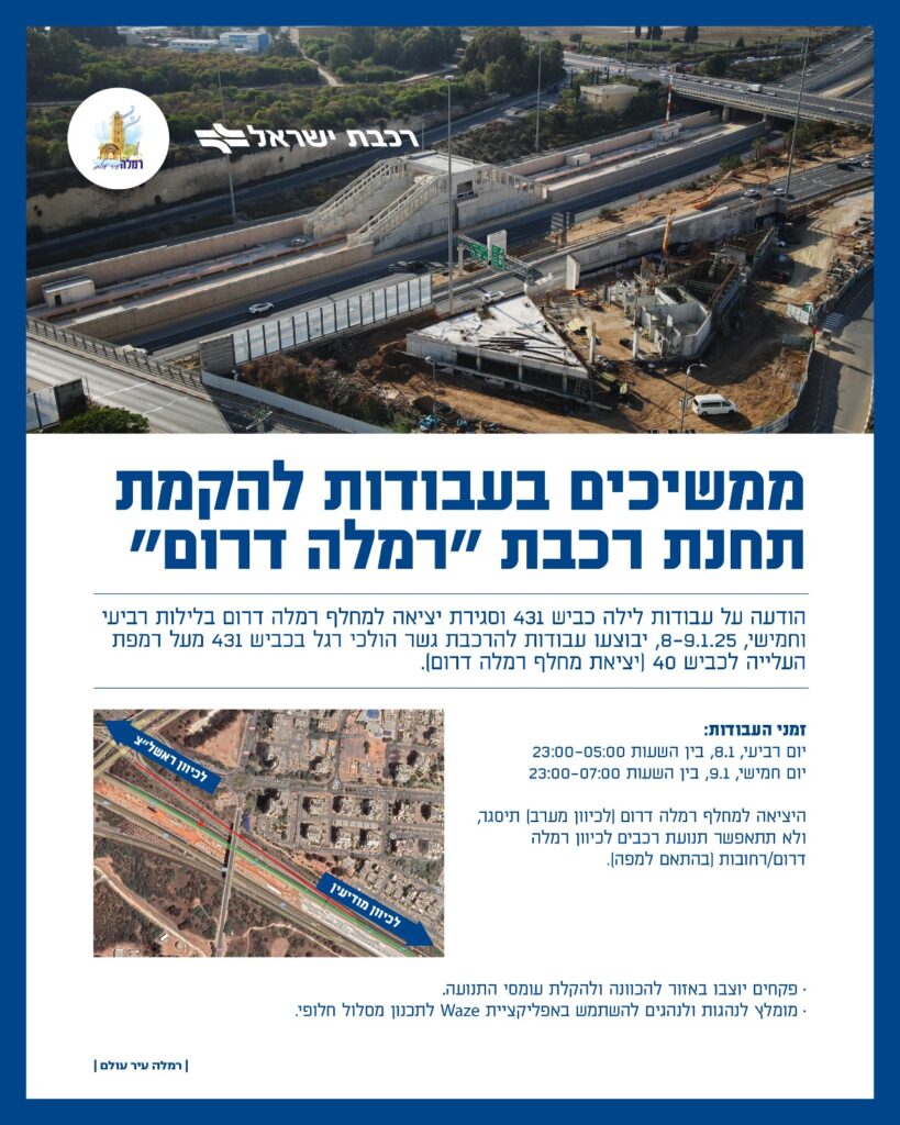 מתי? בלילות רביעי וחמישי, 8-9.1, תיסגר היציאה למחלף רמלה דרום (לכיוון מערב – לבאים מכיוון מודיעין לרמלה) במסגרת עבודות להקמת תחנת רמלה דרום