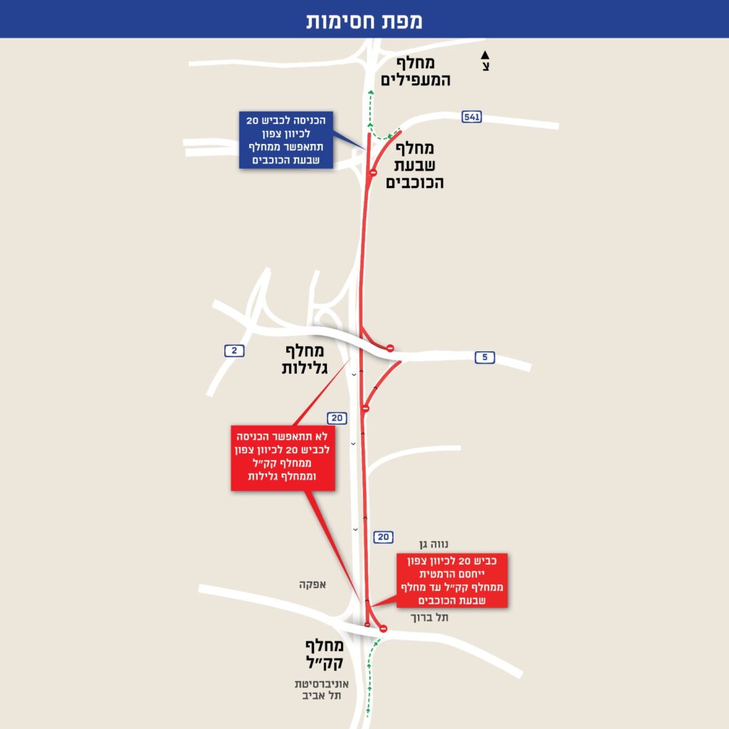• כביש איילון צפון (כביש 20) ייחסם לתנועה לנוסעים בכיוון צפון, בקטע שבין מחלף קק"ל למחלף שבעת הכוכבים