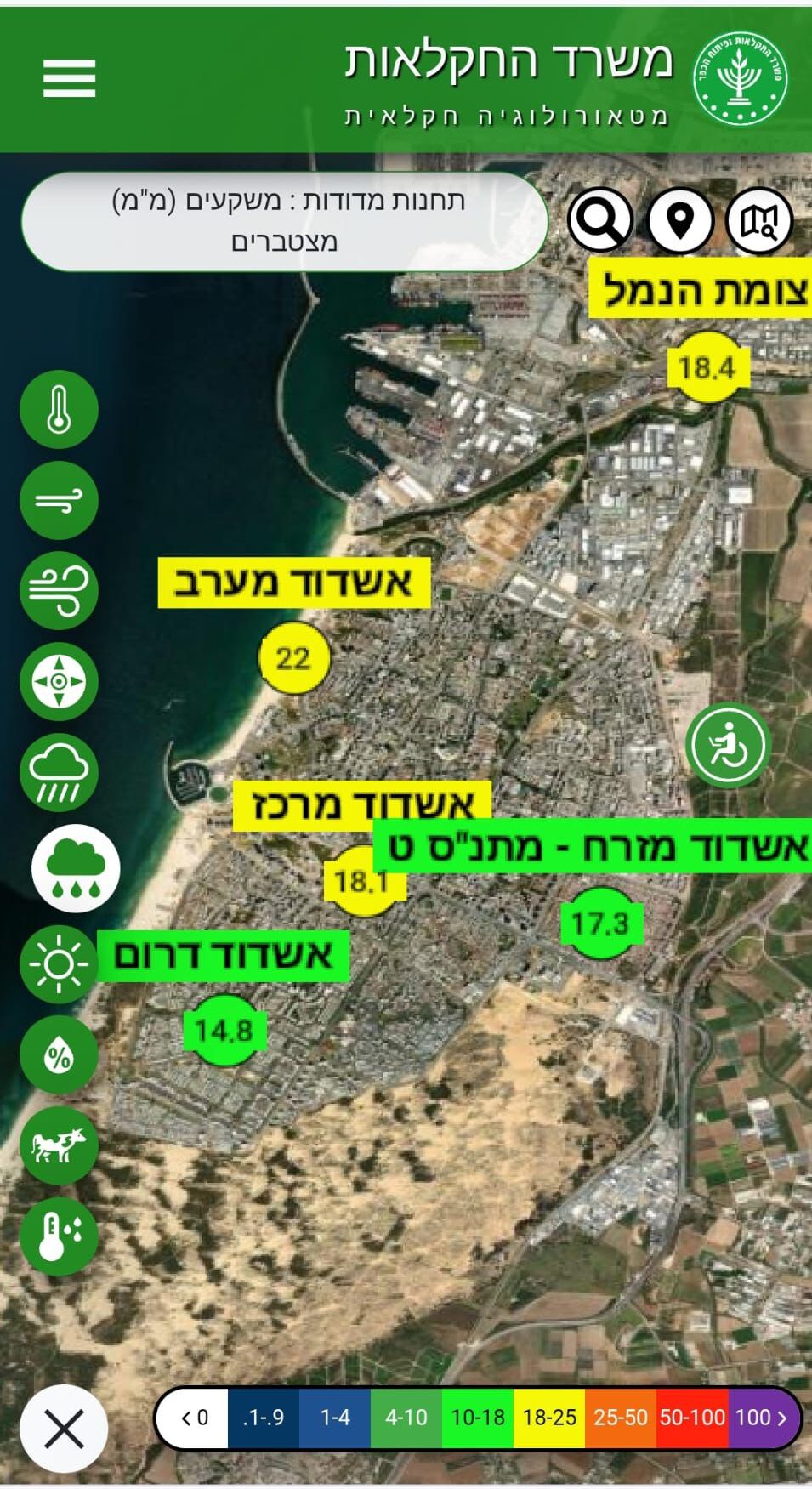 נתוני התחנות המטאורולוגיות באשדוד עם כמויות המשקעים: