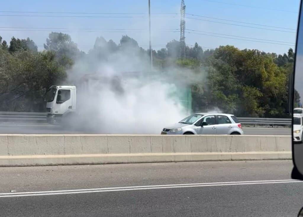 בשל תקלה, משאית נוסעת באיטיות רבה, עשן לבן יוצא מהאגזוז והיא מלווה בניידת משטרה.