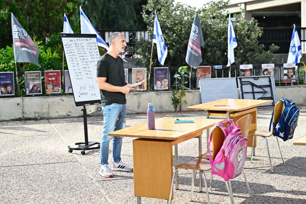 הפורום לשחרור הילדים החטופים קיים היום (שלישי) בכיכר החטופים במוזיאון ת"א, את מיצג בדיקת הנוכחות בכיתה שבמסגרתו עמד השחקן שלום מיכאלשווילי מ"שלישיית מה קשור" שקרא ובדק נוכחות כיתתית בכיתה וקרא את שמותיהם של כל הילדים החטופים הנמצאים בעזה מול כיתה ריקה עם לוח, כיסאות ושולחנות.