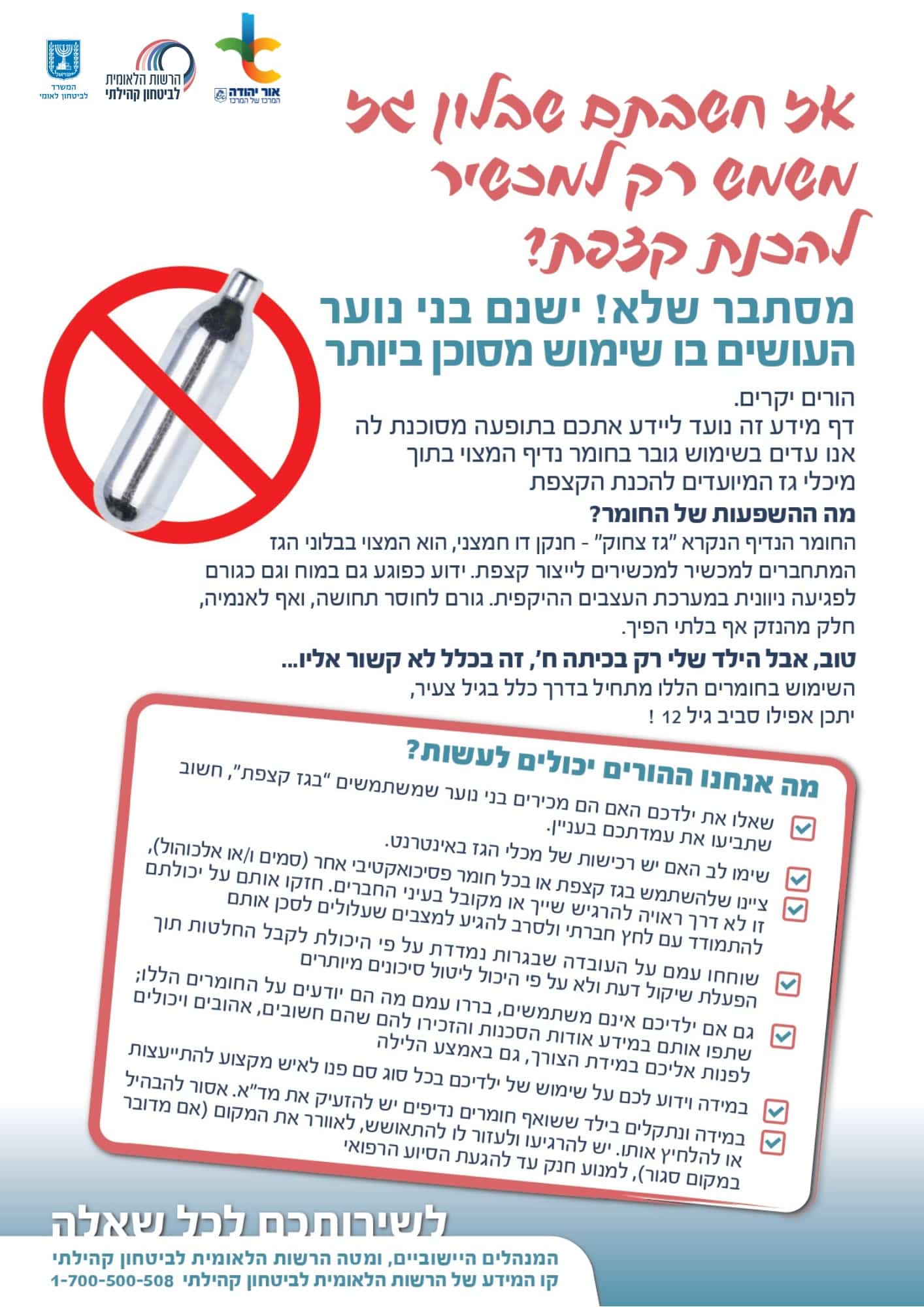* שאלו את ילדכם האם הם מכירים בני נוער שמשתמשים ב"גז קצפת". חשוב שתביעו את עמדתכם בעניין