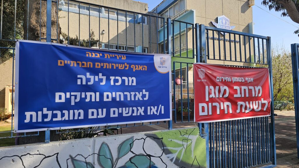בעקבות המצב הביטחוני והצורך במענה מותאם לאוכלוסיות הזקוקות לכך, עיריית יבנה מפעילה מרכז ייעודי לשהיית לילה עבור אזרחים ותיקים ואנשים עם מוגבלות, שאין באפשרותם להגיע למרחב מוגן תקני בזמן ההתגוננות.