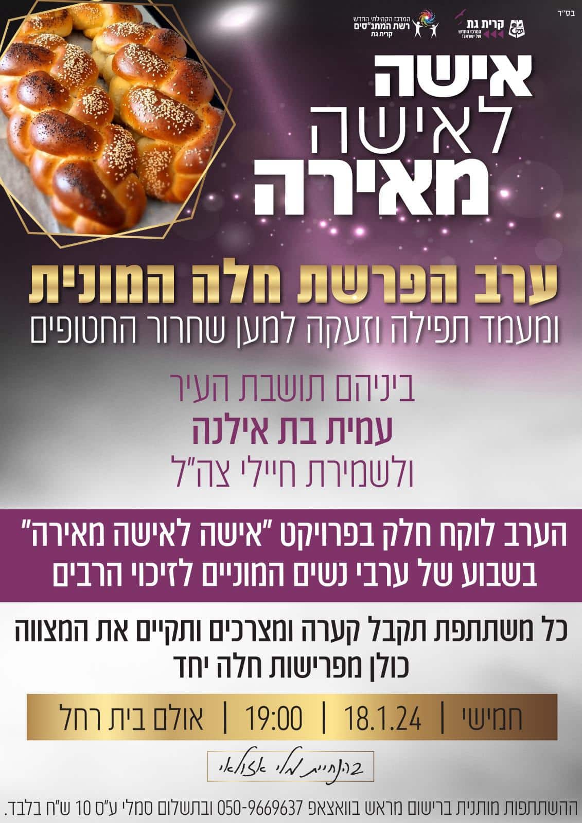 בין היתר תיערך השבוע הפרשת חלה המונית ומעמד תפילה למען שחרור החטופים בניהם עמית בת אילנה וכן לשלום החיילים.