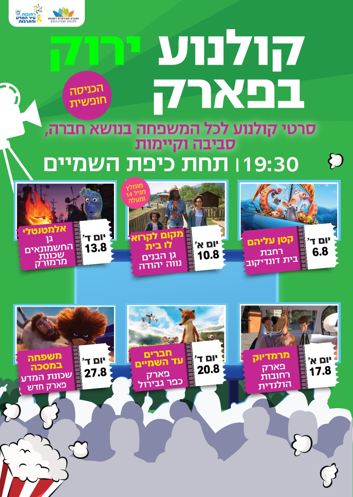 עיריית רחובות, באמצעות החברה העירונית, יוצאת ביוזמה חדשה ומרגשת – 'קולנוע ירוק בפארק', בה יוקרנו לאורך חודש אוגוסט סרטים לילדים, לנוער ולכל המשפחה, ברחבי הפארקים והמוקדים הקהילתיים בעיר – ובחינם.