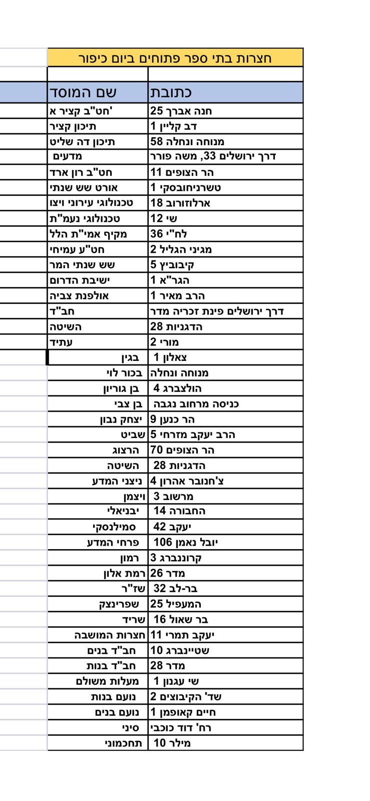 עיריית רחובות תעמיד לרשות המתפללים ביום כיפור חצרות מוצללות בתוך בתי הספר: בהנחיית ראש העיר, רחמים מלול, ייפתחו מחרתיים, ביום א׳, בתי הספר עם חצרות מוצללות לרשות המתפללים, על מנת שיוכלו להתפלל באוויר הפתוח. מצורפת רשימת בתי הספר. המוקד העירוני 106 עומד לרשות התושבים ולהכוונתם לבית הספר הפתוח הקרוב לביתם.