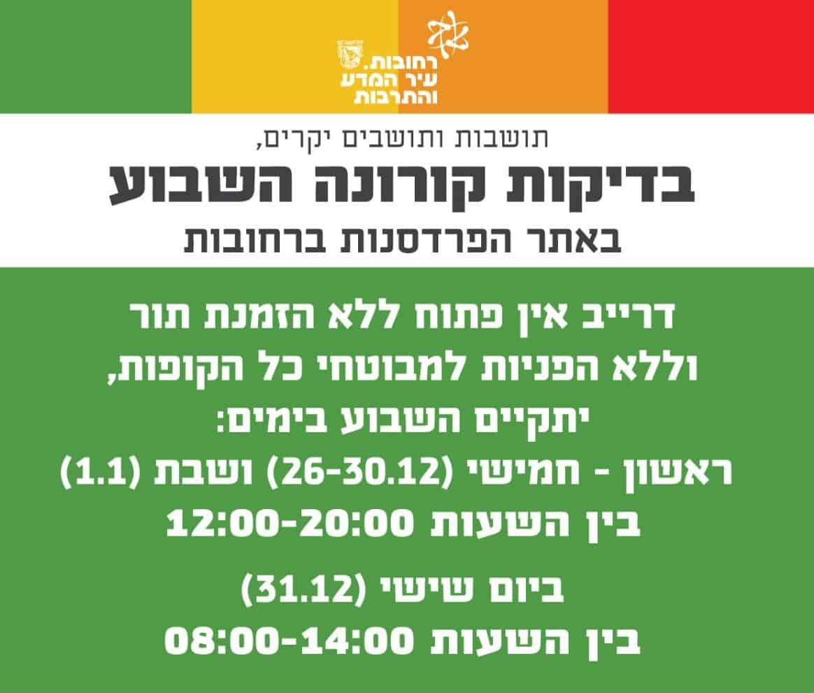 באתר הבדיקות ברחובות – אתר הפרדסנות נבדקו השבוע כ-1700 איש בממוצע, מידי יום. משמעות הפיכתה של העיר לכתומה או חלילה אדומה היא בבתי הספר העל יסודיים, שבהם יעברו ללמידה מקוונת במידה אם אין 70% מחוסנים בכיתה. חיתוך מצב העיר נעשה לפי צבע העיר מדי יום רביעי ומתחיל בשבוע הלימודים שלאחר מכן, ביום ראשון שלאחריו.