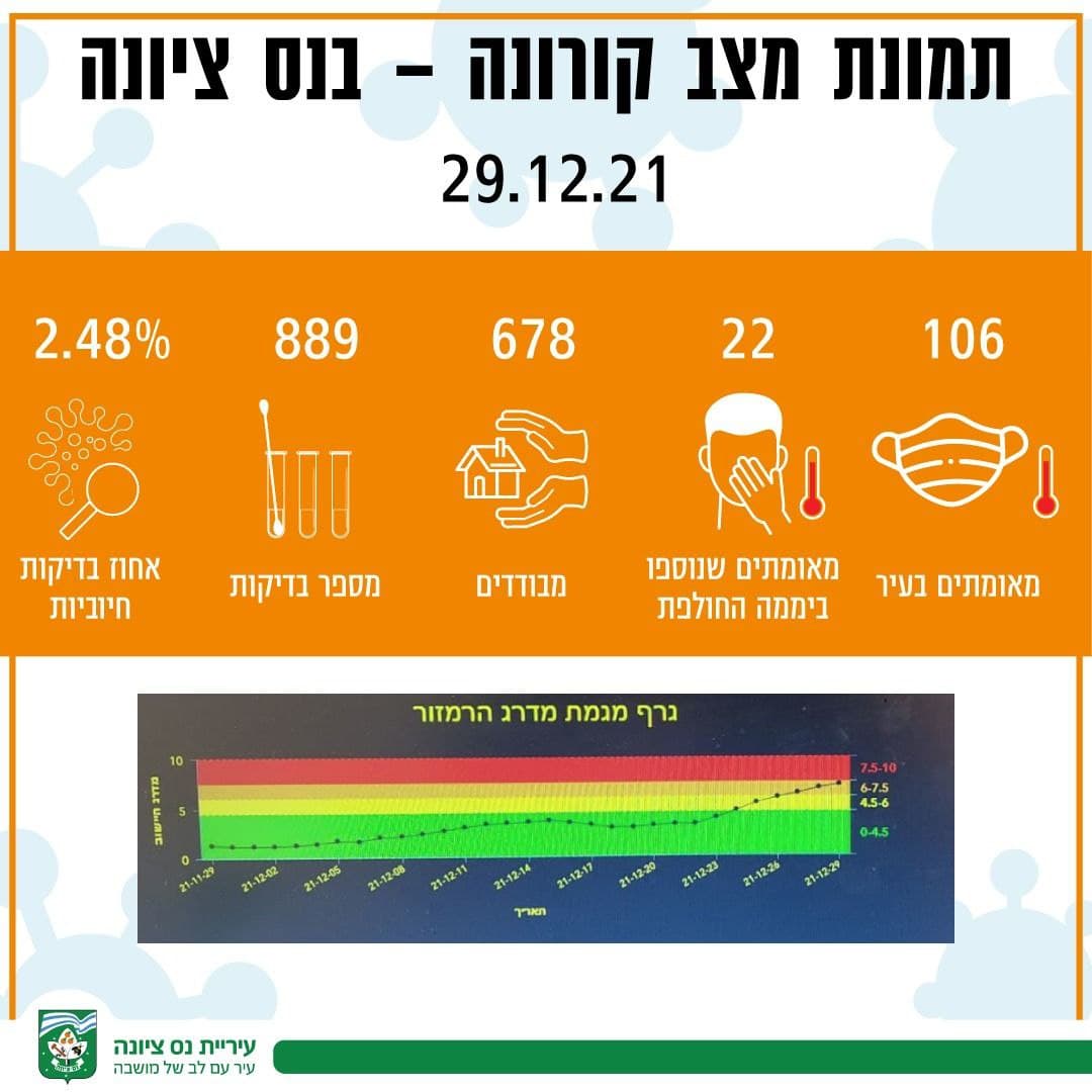 106 מאומתים, 22 נוספו ביממה האחרונה ו-78 תושבים נמצאים בבידוד – אלו הנתונים של נס ציונה נכון להיום (רביעי). בנוסף, אחוז בדיקות חיוביות גבוה מאוד של 2.48%. בתוך כך, התבצע חיתוך צבע העיר, המתייחס להפעלת מערכת החינוך בשבוע הבא, החל מיום ראשון 2.1.21 ונס ציונה כתומה.