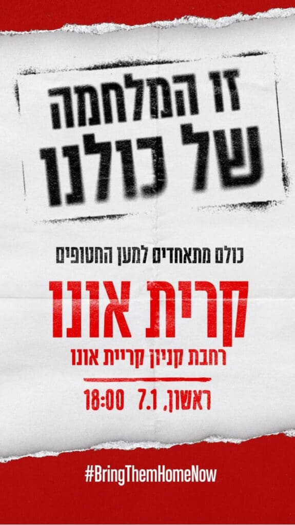 מטה המשפחות להחזרת החטופים והנעדרים יקיים היום (ראשון, 7.1.24) בשעה 18:00 עצרת להחזרת החטופים והנעדרים ברחבת קניון קריית אונו.