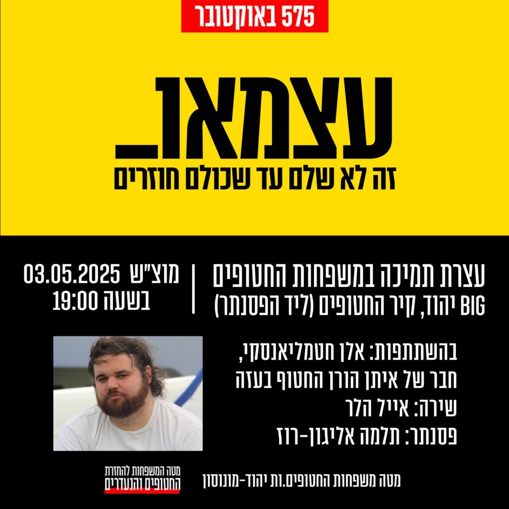 סוזן עמוסי, ממובילות מטה משפחות החטופים ביהוד-מונוסון, מודיעה על קיום עצרת התמיכה במשפחות החטופים, שתיערך מחר [שבת] בשעה 19:00 בביג יהוד [קיר החטופים, ליד הפסנתר]