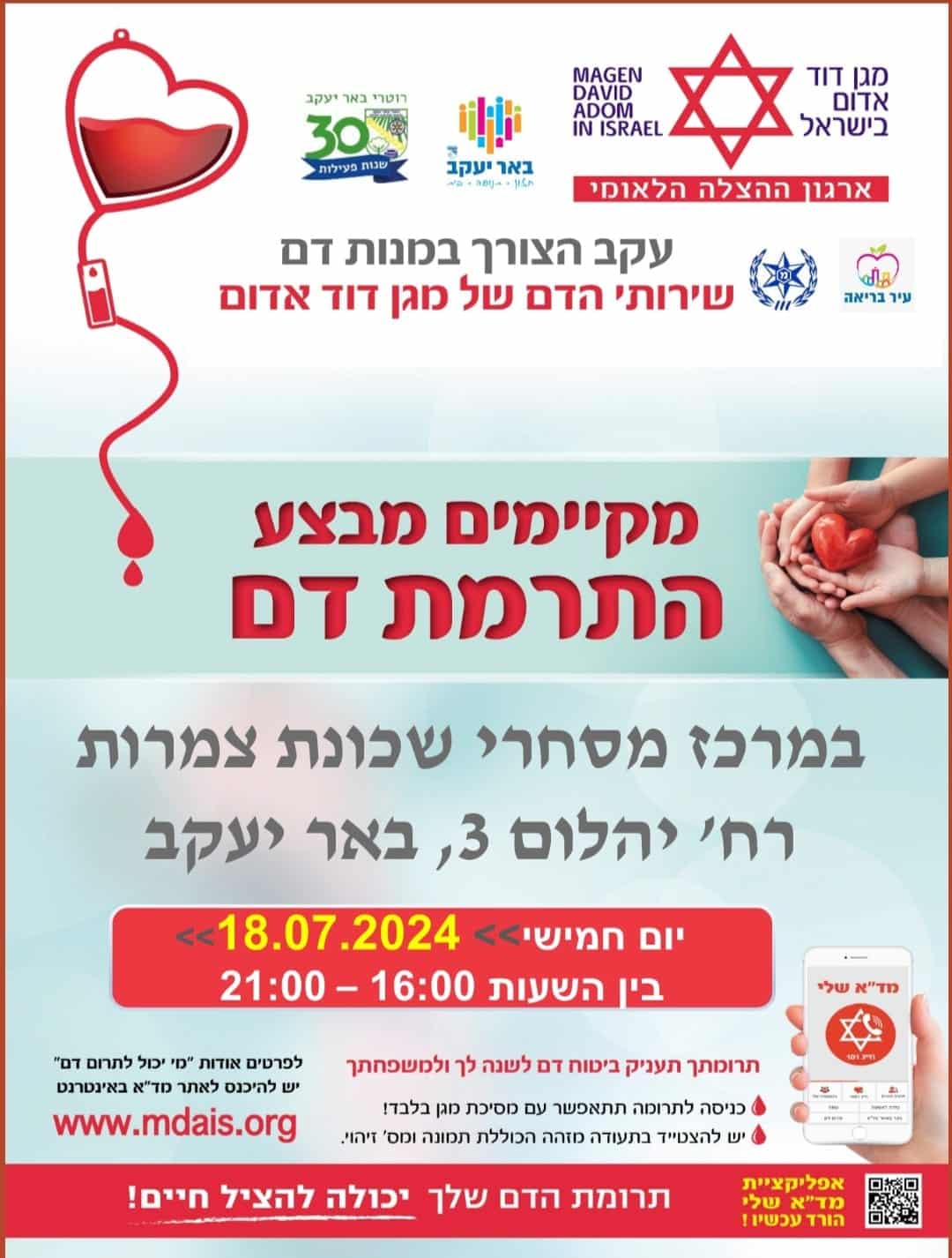 תושבות ותושבי באר יעקב מוזמנים להגיע להתרמת דם שתיערך על ידי שירותי הדם של מגן דוד אדום במרכז מסחרי שכונת צמרות ברחוב יהלום 3 בבאר יעקב.