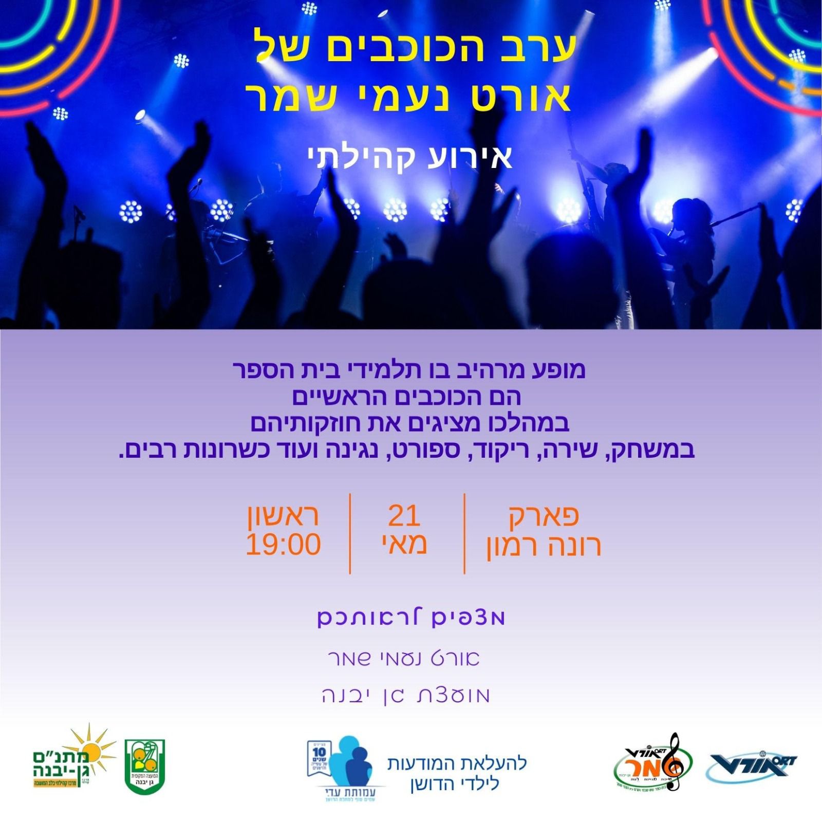ביום ראשון 21.5.23 בשעה 19:00 יתקיים ערב הכוכבים של "אורט נעמי שמר". מדובר באירוע כישרונות ענק הכולל מופע מושקע של תלמידי בית הספר המציג את חוזקותיהם וכישוריהם במגוון תחומים.