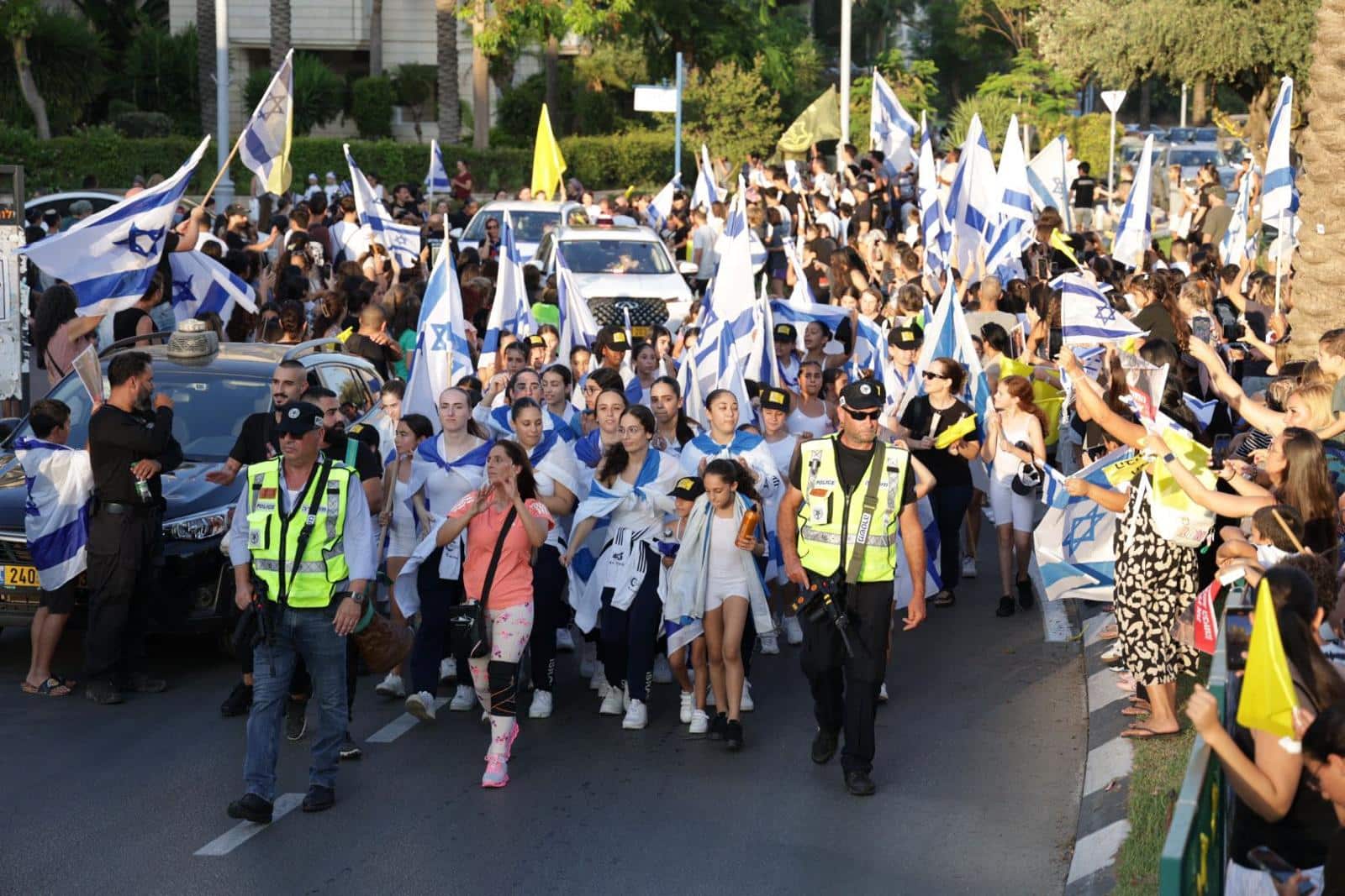 ברחוב בר לב המרכזי בעיר נפרסו מאות תושבים שהמתינו לו עם דגלי ישראל וכרזות שהכינו במיוחד עבורו. אלמוג יחד עם בני משפחתו עבר בין הקהל ברכב וזכה לתרועות רמות ואהבה גדולה.