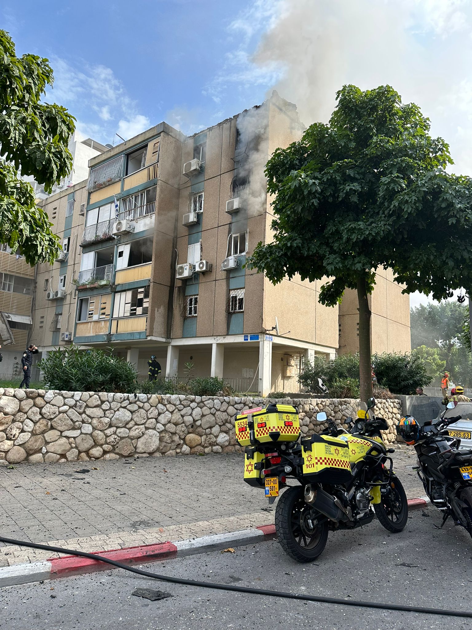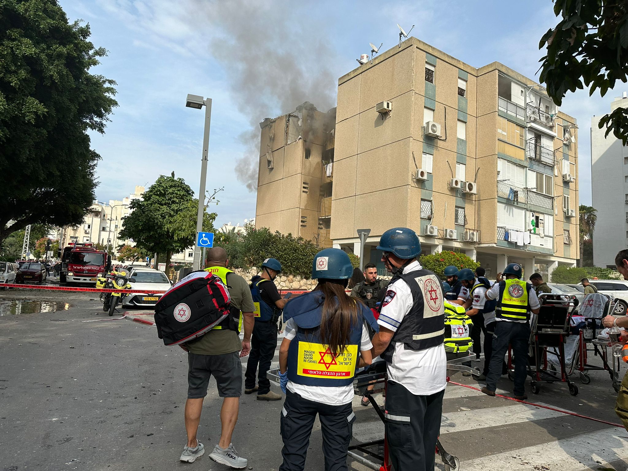 "מיד ששמעתי את האזעקות נכנסתי למרחב מוגן והמתנתי על פי הנחיות פיקוד העורף. כעבור מספר רגעים שמעתי רעש חזק מאוד של פיצוץ וכשיצאתי החוצה ראיתי שמדובר בפגיעה ישירה. דיווחתי למוקד מד"א על האירוע על מנת שישלחו צוותים רפואים למקום. הרחקתי את כל מי שהיה באזור והתחילו לצאת אלינו נפגעים לבחוץ, צעיר כבן 20 יצא אלינו מהבניין כשהוא בהכרה מלאה וסובל מחבלות בראש ובגפיים העקנו לו טיפול רפואי והוא פונה בניידת טיפול נמרץ של מד"א לבית החולים כשמצבו בינוני. 2 פצועים נוספים אישה כבת 70 וגבר כבן 40 במצב קל מטופלים ע"י צוותי מדא. הכוחות של מד"א נמצאים במקום ומאבטחים את הסריקה בבניין וערוכים להעניק טיפול רפואי במידה ויהיו נפגעים נוספים".