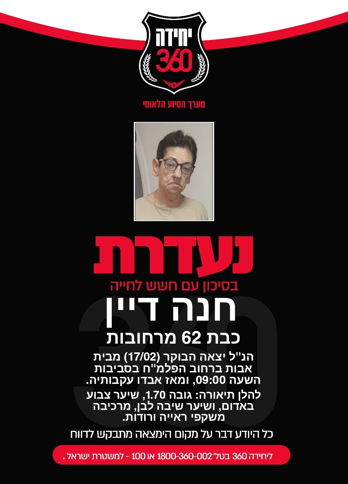 כל היודע דבר על מקום המצאה מתבקש להודיע ליחידה 360 או למשטרת ישראל.