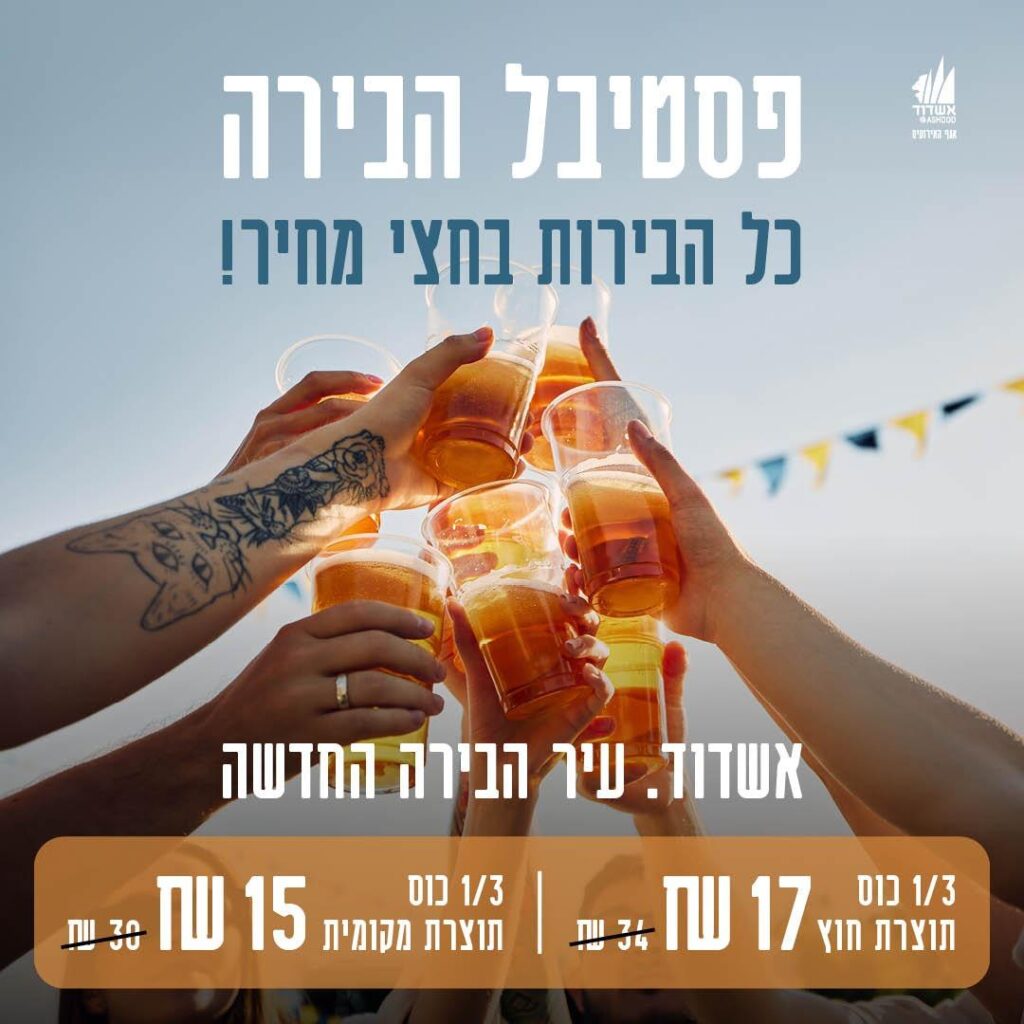 - 1/3 כוס בירה מקומית: 15 ש"ח בלבד (במקום 30 ש"ח).