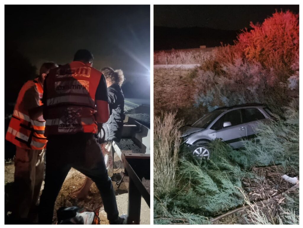 יוסף מרציאנו ורונן קורן חובשים באיחוד הצלה שהגיעו ראשונים למקום מסרו: "מדובר בתאונה עצמית – רכב שהחליק לתעלה בצד הדרך.