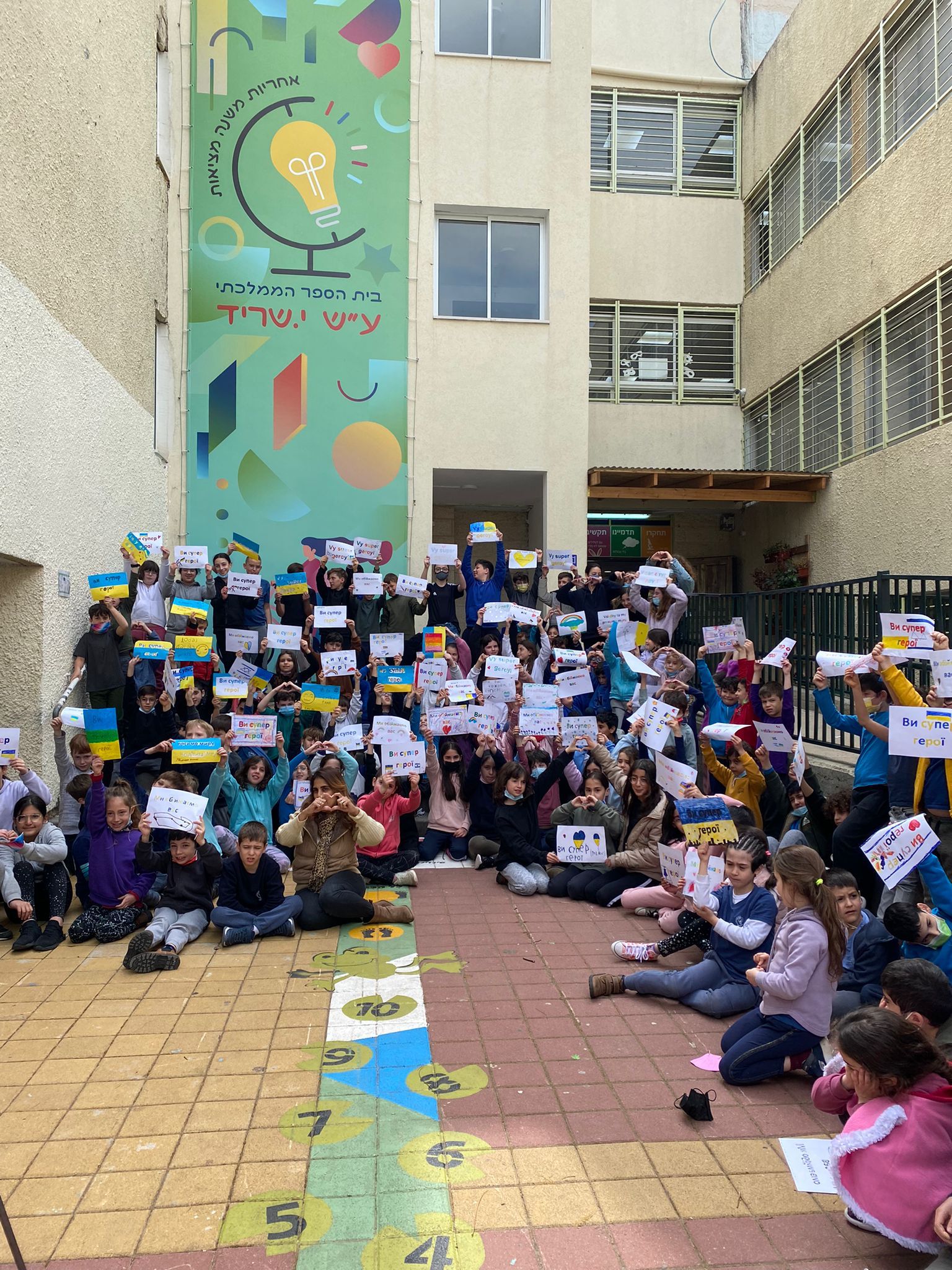 כבר בראשית המלחמה, צוות ביה"ס החליט לרכז תשומת לב מיוחדת למצב, ונתן מעטפת רגשית לתלמידים שחווים את המלחמה הרחוקה מקרוב. ביוזמה משותפת עם הנהגת ההורים, עלה הרעיון לשלוח מסר של חברות, אחווה, סולידריות ותקווה לילדים באוקראינה. תלמידת כיתה ג2, ליה אוסוב, יצרה מצגת שאותה היא העבירה בין הכיתות והסבירה לתלמידים על המלחמה המתנהלת והיוותה בסיס לשיחות על הנושא עם המחנכות ובליווי יועצת ביה"ס ענת ויתקון-קורון. בהמשך לכך, בשיעורי אומנות עם המורה עירית זמיר, התלמידים דיברו על מצב הילדים באוקראינה ויצרו כרזות באוקראינית ובהן משפטים של תמיכה וחיזוק: "יש לכם חברים כאן", "אתם גיבורי על", "אנחנו חושבים עליכם", "אנחנו מחבקים אתכם" ו"כולנו ילדים ואנחנו מבקשים שלום". לסיכום הפרויקט הילדים הצטלמו עם הכרזות לסרטון מרגש שנשלח, בעזרת הורים מביה"ס, לילדים שעדיין נמצאים באוקראינה ולכאלה שבשל המלחמה נאלצו לברוח מבתיהם. מבית הספר נמסר: "תודה לכל השותפים שלנו – למפקחת ויקי עזיאל ולאגף החינוך בעיריית רחובות על התמיכה – לזוהר בלום מ"מ רה"ע ומחזיק תיק החינוך, לאפרת צוקרמן, מנהלת אגף החינוך, לשרה והב, מנהלת מח' חינוך יסודי, לאלכס לשצ'ינסקי מתוכנית אפיקי תקשורת של קרן קרב, שצילם וערך את הסרטון במסגרת השיעורים בביה"ס, להורים שעזרו בתרגום ובהכנה ולכל מי שלקחו חלק בהפקה".