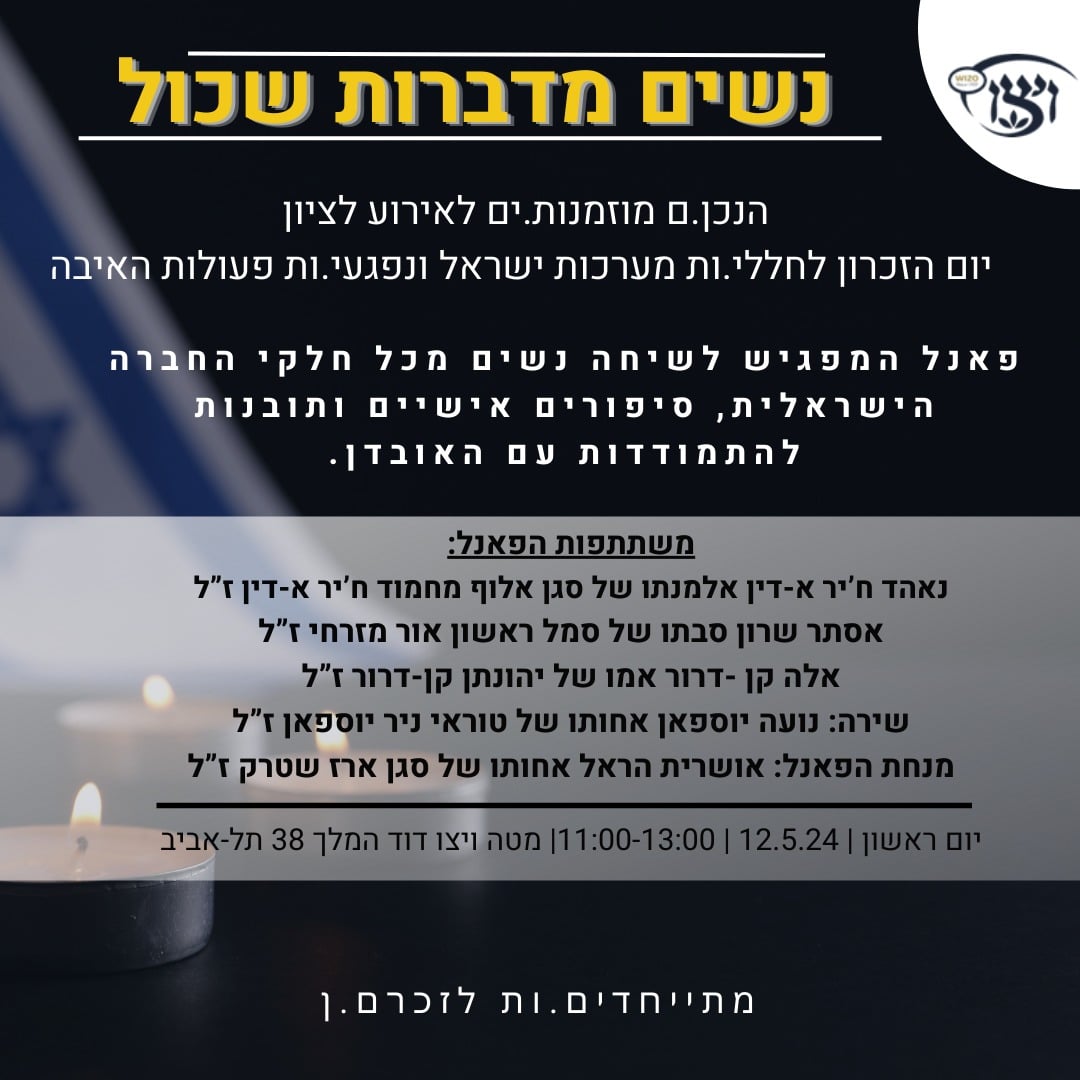 ויצו מזמינה אתכן.ם להצטרף למפגשי "נשים מדברות שכול", אשר יתקיימו זו השנה השלישית ברחבי הארץ במסגרת טקסי יום הזיכרון לחללי וחללות מערכות ישראל ונפגעי ונפגעות פעולות האיבה, ויעסקו בחוויית השכול הייחודית מנקודת מבט נשית, במטרה להשמיע את קולותיהן האישיים של הנשים שחוו אובדן בשל מלחמת חרבות ברזל ומלחמות ישראל.