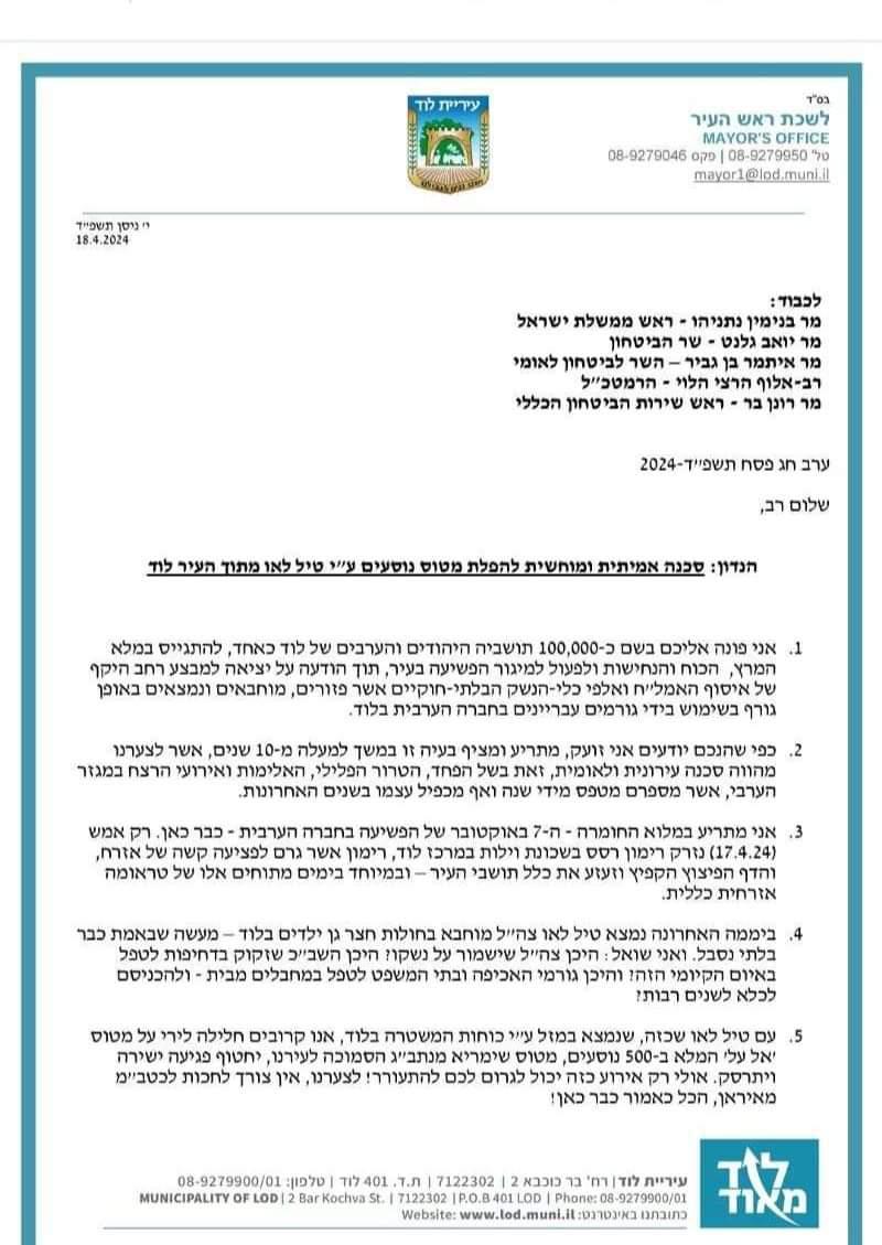 לידי מערכת חדשות 08 הגיע מכתבו של עו"ד יאיר רביבו, ראש העיר לוד המופנה אל ראש הממשלה, שר הביטחון, השר לביטחון לאומי, הרמטכ"ל וראש השב"כ.