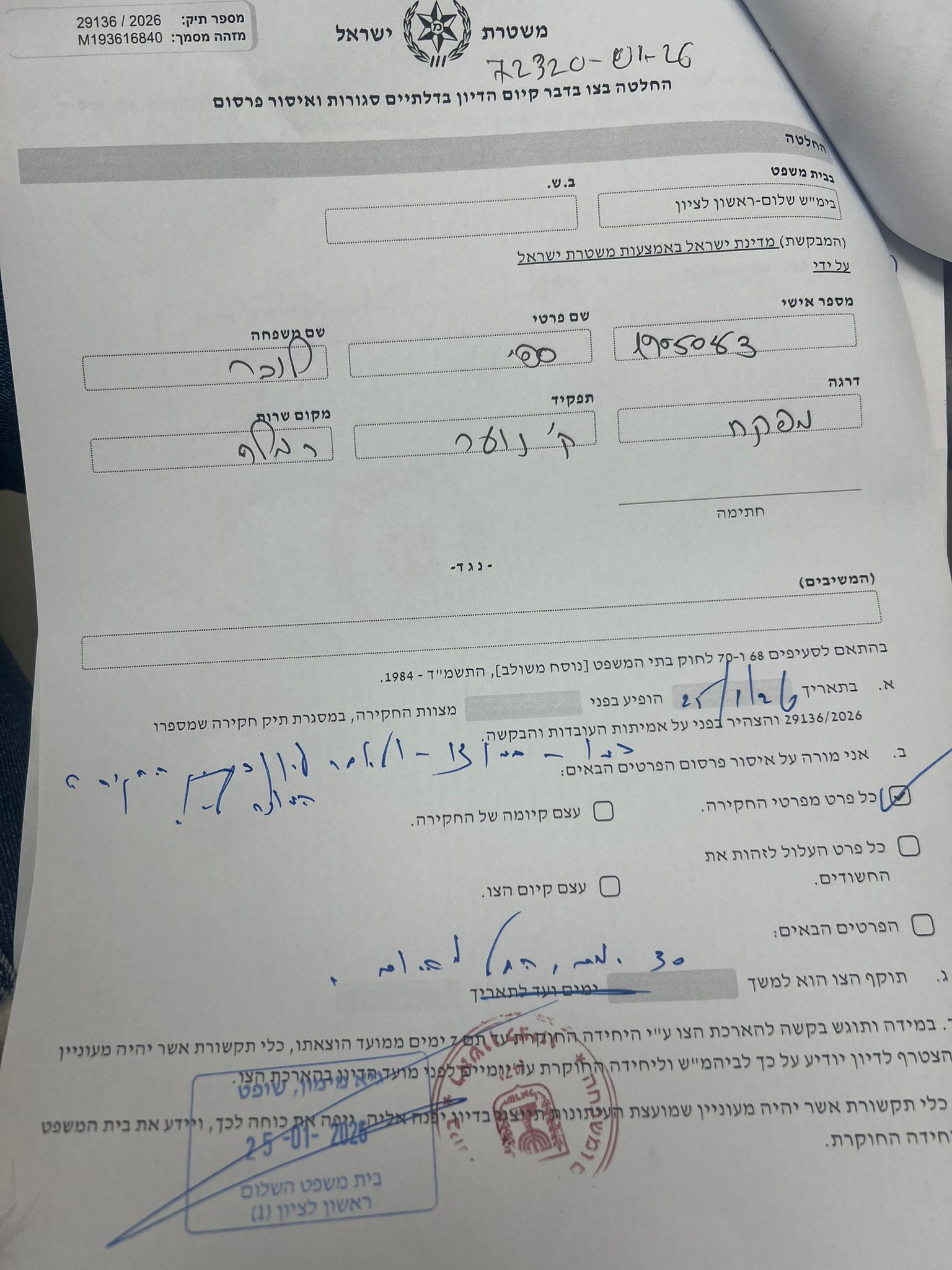 בית משפט השלום בראשון לציון נעתר היום (ראשון, 25.1.26) לבקשת חוקרי תחנת רמלה והוציא צו איסור פרסום בתיק חקירה שמספרו 29136/2026.