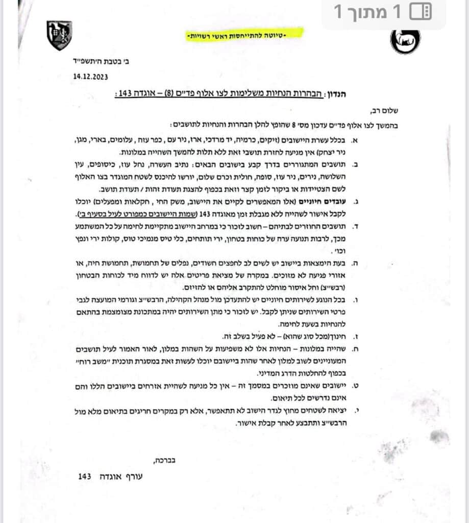 בסוף השבוע האחרון פרסם עורף אוגדה 143 מכתב הבהרות והנחיות משלימות לצו אלוף פיקוד דרום.