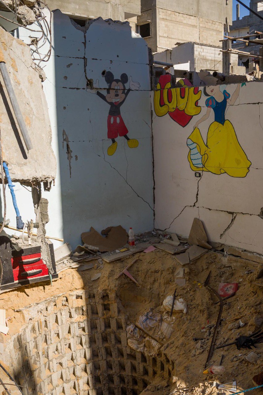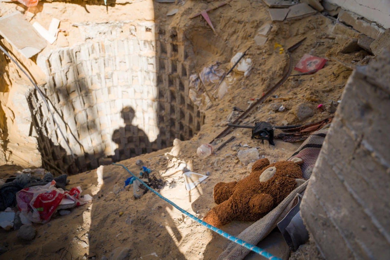 הפיר שמוביל למנהרה בה אותרו גופותיהם של החטופים כרמל גת ז"ל, עדן ירושלמי ז"ל, הירש גולדברג-פולין ז"ל, אלכסנדר לובנוב ז"ל, אלמוג סרוסי ז"ל ורס"ר אורי דנינו ז"ל, אותר לצד בובות וציורי קיר של דמויות מצוירות בחצר ילדים.