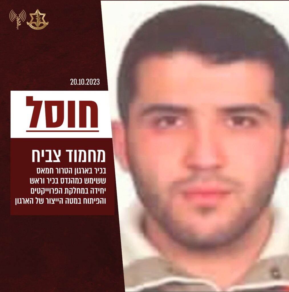 צה"ל חיסל את מחמוד צביח, בכיר בארגון הטרור חמאס ששימש כמהנדס בכיר וראש יחידה במחלקת הפרוייקטים והפיתוח במטה הייצור של הארגון.