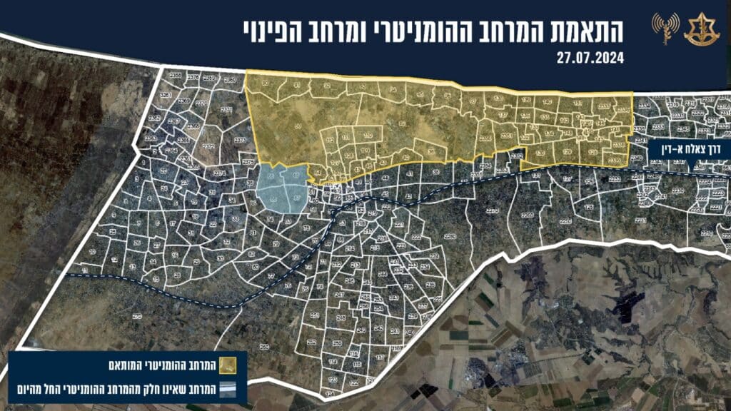 לכן, בעת הזו תתבצע התאמה של המרחב. ההתאמה הינה ביחס למידע מודיעיני מדויק לפיו ארגון הטרור חמאס מיקם תשתיות טרור באזור שהוגדר כמרחב הומניטרי.