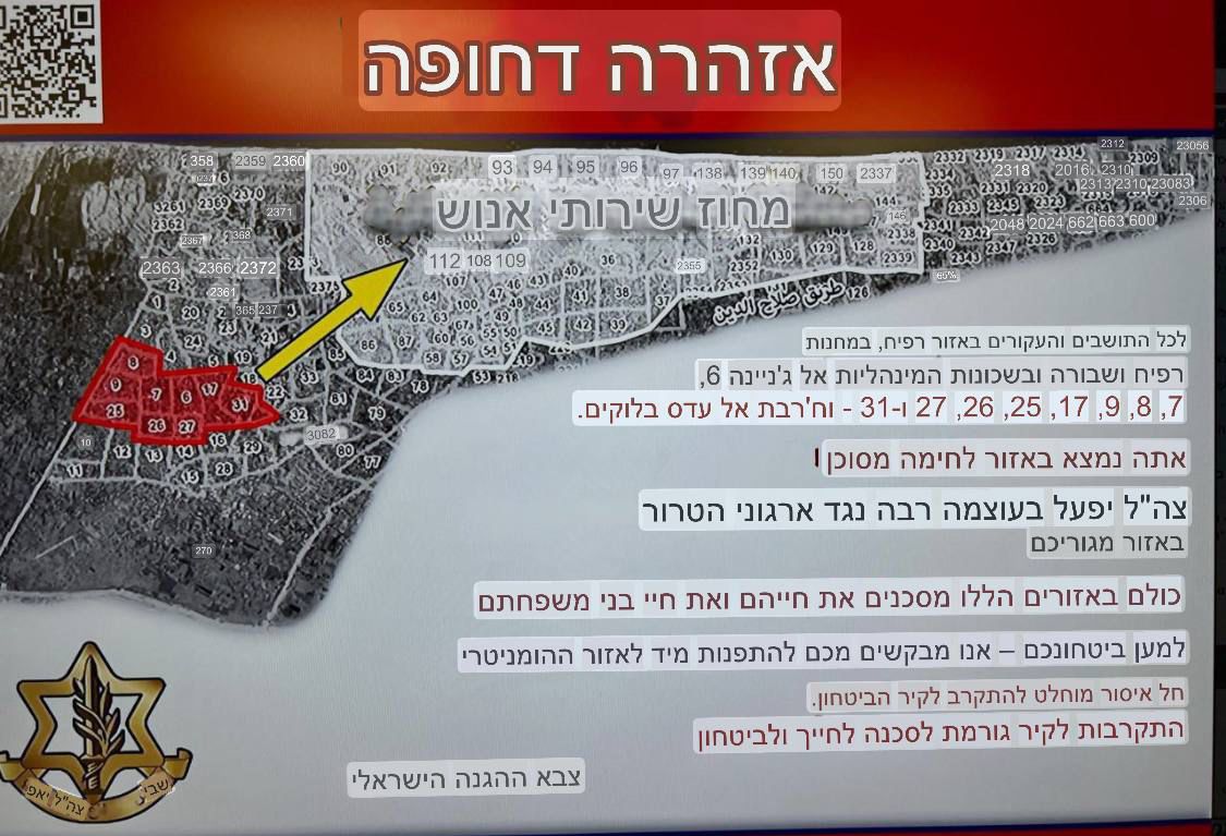 בהמשך לפעילות צה"ל במרחב מזרח רפיח ובהתאם לאישור הדרג המדיני, ולאור פעילות טרור וירי של חמאס מהמרחב צה״ל קרא לאוכלוסייה מאזורים נוספים בשכונות המזרחיות של רפיח להתפנות באופן זמני אל המרחב ההומניטרי המורחב במוואסי.