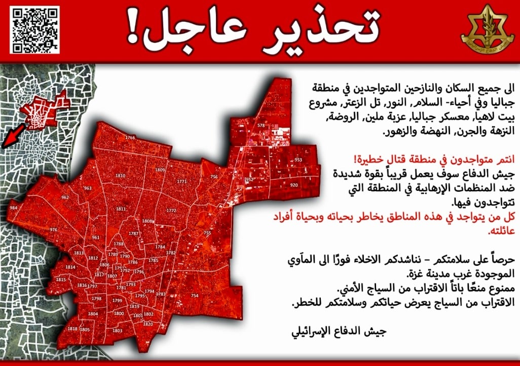 בעקבות ניסיונות חמאס לשקם יכולות ותשתיות טרור, והימצאות פעילי טרור במרחב, קרא צה״ל הבוקר לאוכלוסייה בג׳באליא והשכונות במרחב להתפנות באופן זמני אל המחסות במערב העיר עזה. המהלך בוצע כדי להרחיק את התושבים ממרחב הלחימה בהתאם לדין הבינלאומי.