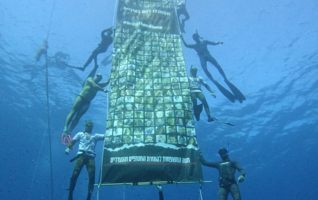 האירוע הקסום התרחש בחוף המזח, ברצועת החוף הדרומית של אילת: כ 100 צוללים עם שלט באורך 10 מטרים הנושא את תמונות החטופים, בקריאה להחזרתם גם ממעמקי הים. אליהם הצטרפו כ 100 איש נוספים על החוף ובתוך המים, חלקם בצלילה, חלקם בשנירקול, חלקם בשחיה אבל כולם במסר אחד, להחזיר את כולם עכשיו!