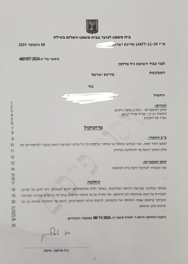 פרשיית האונס באילת במסגרת דיון הארכת מעצר שהסתיים לפני זמן קצר [שישי], נעתר בימ״ש השלום באילת לבקשת הסנגור, והורה על צו איסור פרסום גורף על כל פרט מפרטי הפרשייה, פרסום שמה וזהותה של הקטינה, לרבות פרטי המעורבים וזאת עד להחלטה אחרת או עד להגשת כתב אישום.