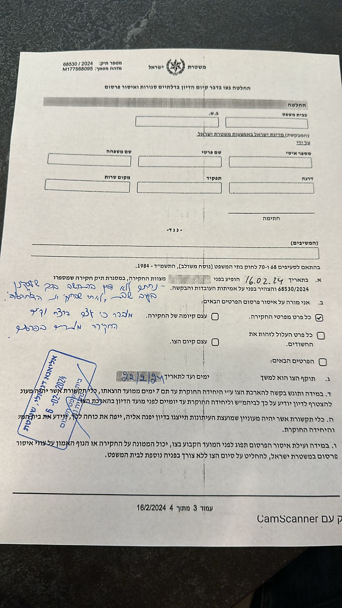 בימ"ש השלום הוציא כעת צו איסור פרסום בתיק: 68530/2024 הנחקר ביל״פ שפלה, שעניינו אירוע רצח שאירע היום 16.2.24 בלוד. הצו אוסר לפרסם כל פרט מפרטי החקיֹרה ותוקפו עד תאריך 22.2.24 .