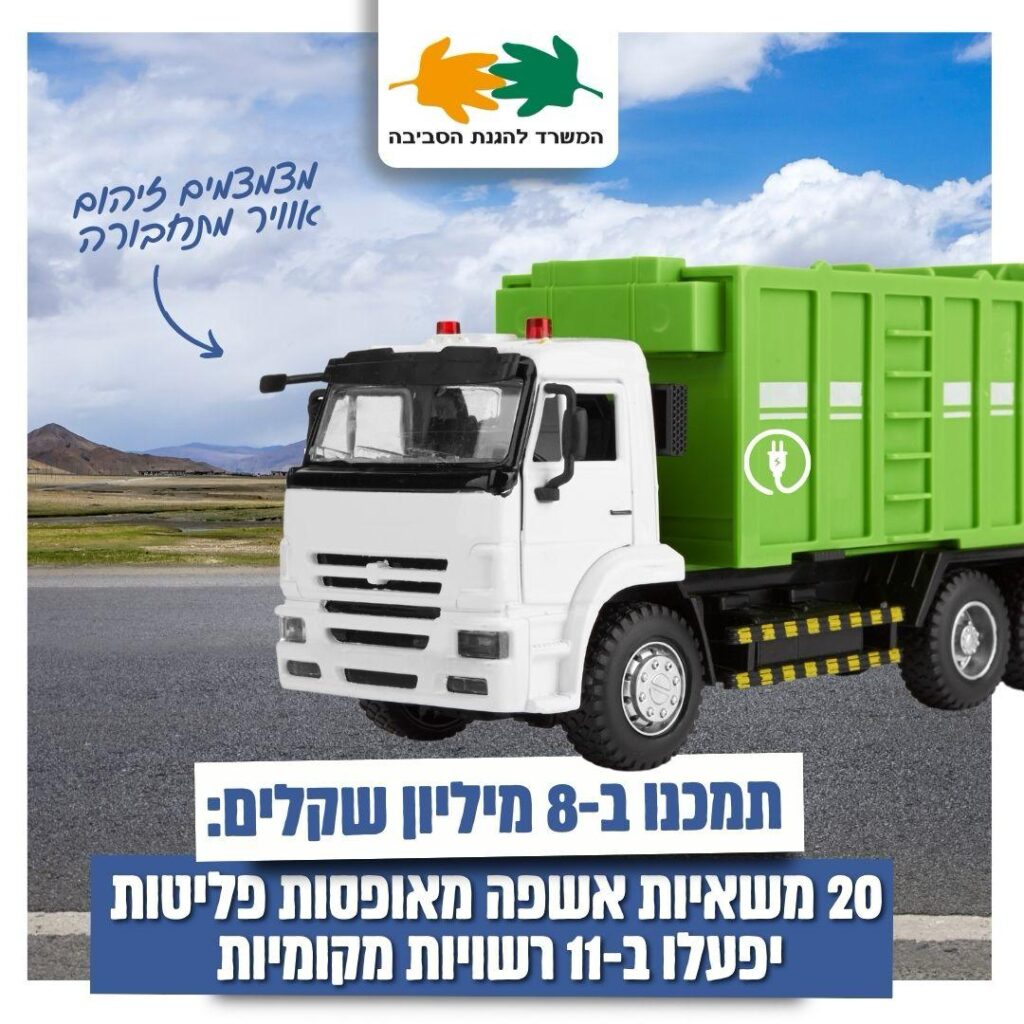 20 משאיות אשפה חשמליות ומאופְּסות פליטות יפעלו ב-11 רשויות מקומיות בישראל לאחר שזכו בתמיכה של המשרד להגנת הסביבה בסכום כולל של כ-8 מיליון שקלים – צעד נוסף לצמצום זיהום אוויר מתחבורה
