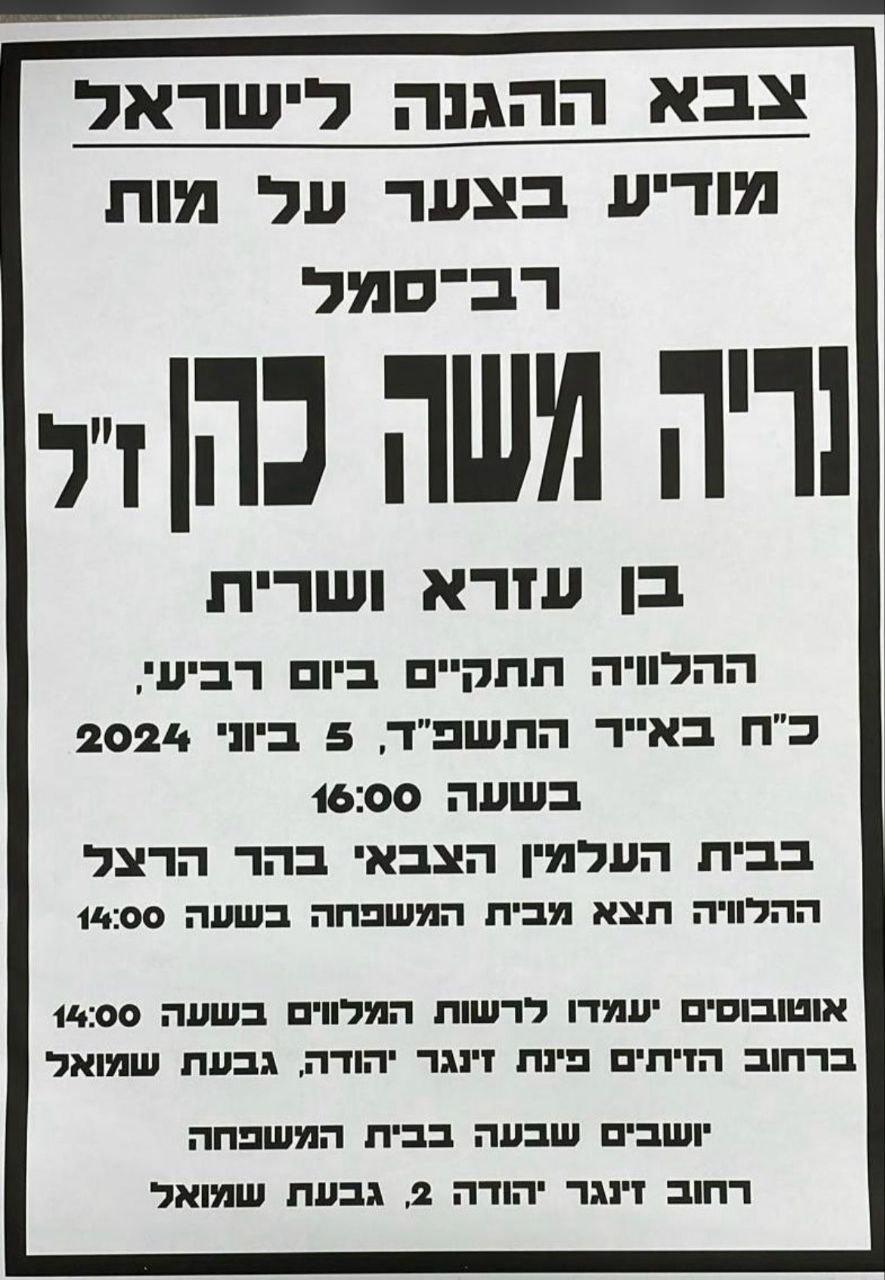 קהילת אבני החושן בגעת שמואל, מרכז תורני פתאל, מודיעה בתדהמה על נפילתו של בן הקהילה, נריה משה כהן הי"ד בן עזרא ושרית, שנהרג בתאונה מבצעית בדרום