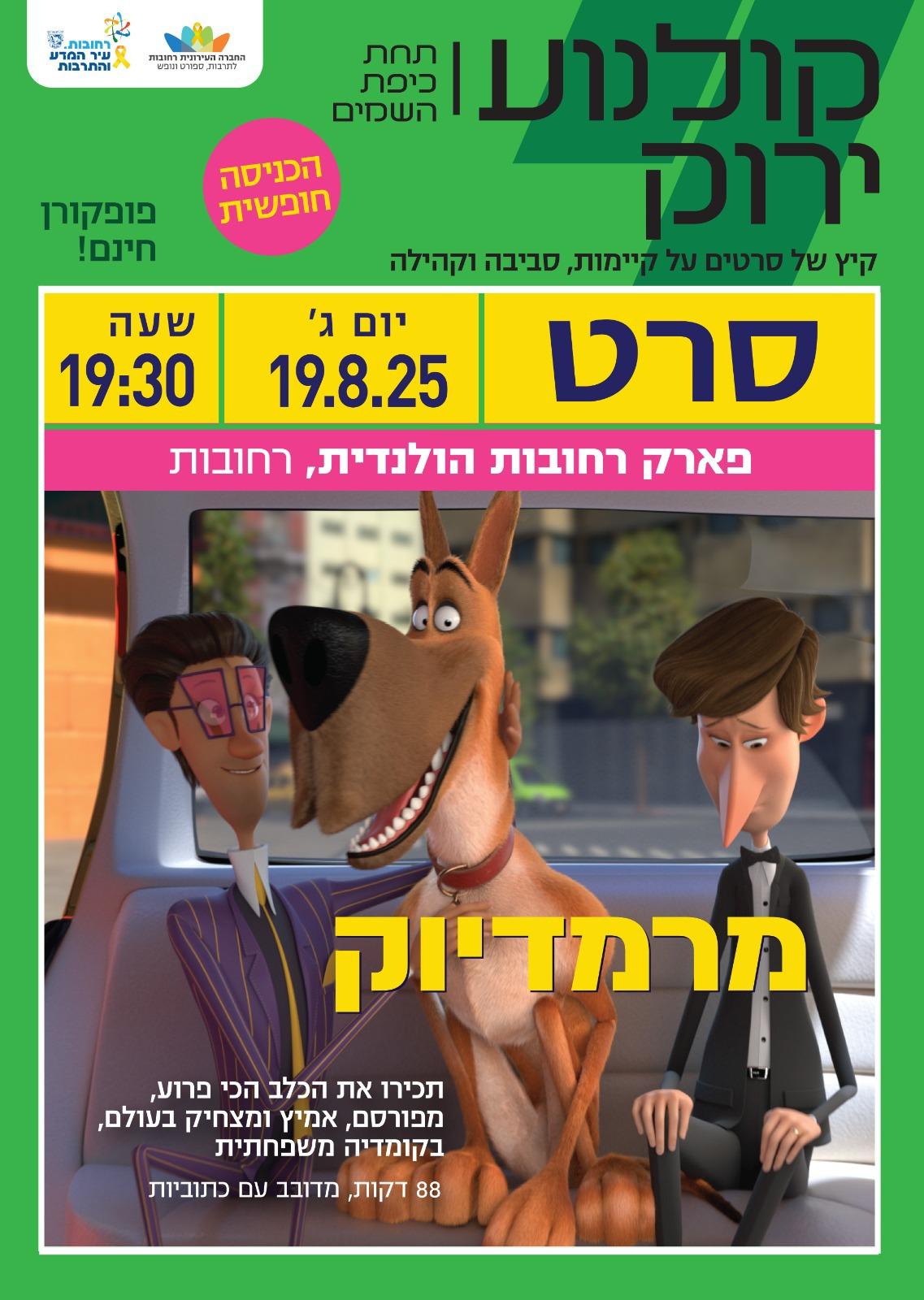 במסגרת פסטיבל "קולנוע ירוק בפארק" של עיריית רחובות, יתקיים הערב (ג', 19.8) אירוע קולנוע חינמי בפארק רחובות ההולנדית. החל מהשעה 19:30, יוקרן הסרט המצויר לכל המשפחה "מרמדיוק" תחת כיפת השמיים.