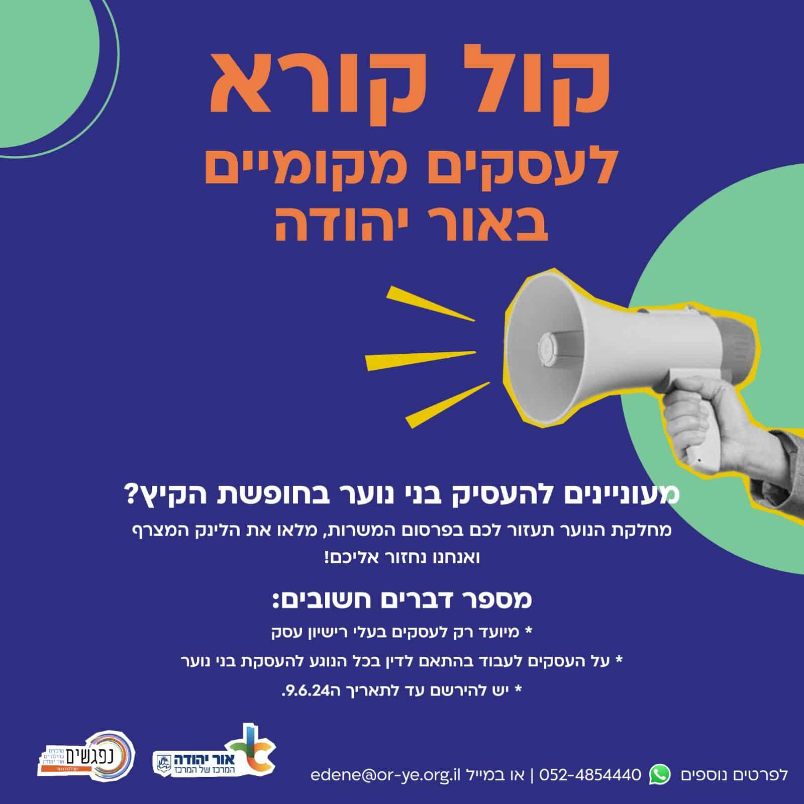 שימו לב: הקול הקורא מיועד רק לעסקים בעלי רישיון עסק. על העסקים לעבוד בהתאם לדין בכל הנוגע להעסקת בני נוער. יש להירשם עד לתאריך 9.6.24