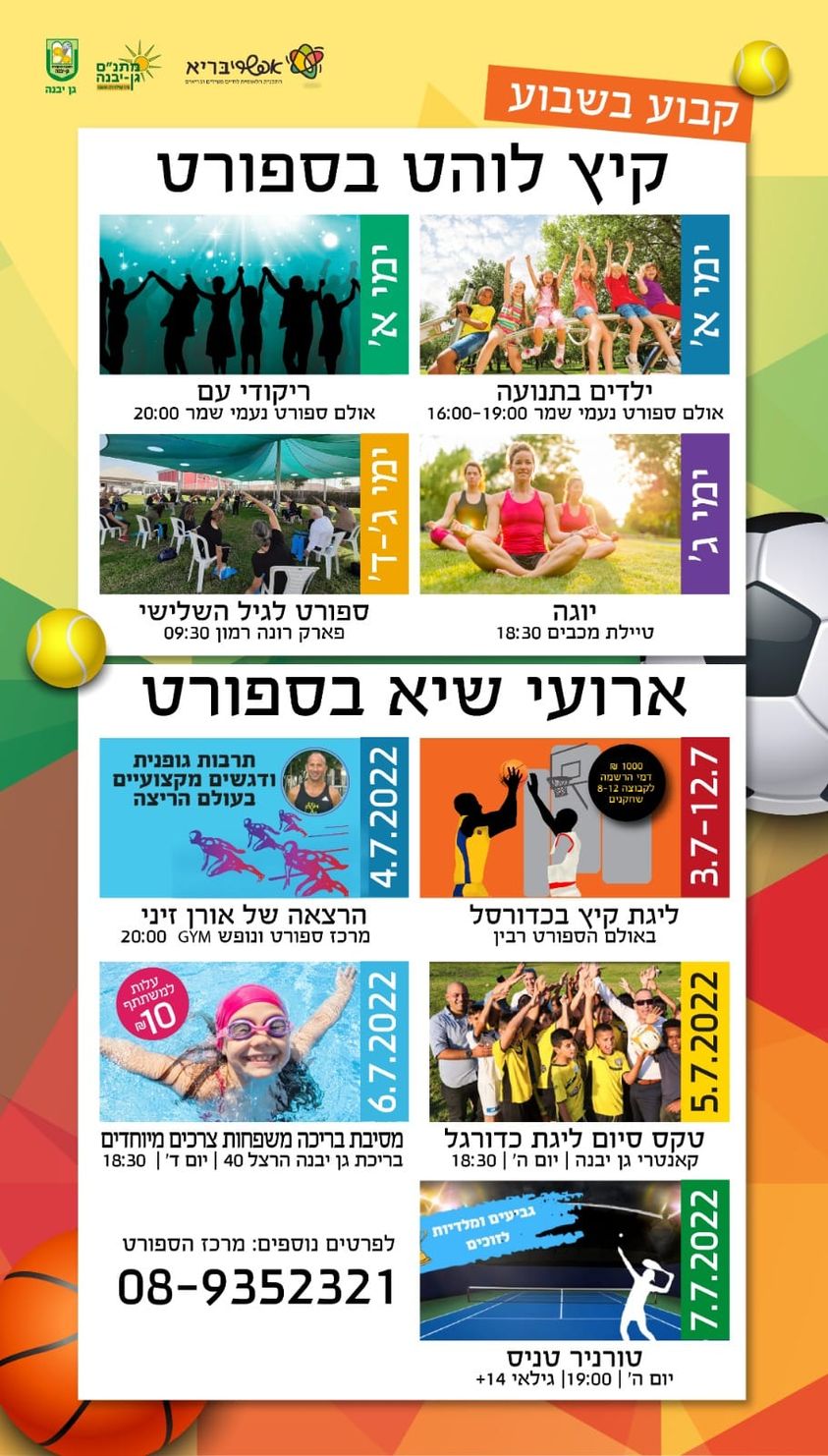 מה משותף לילדים, נוער, מבוגרים ובני הגיל השלישי מגן יבנה? כולם עושים ספורט! יחד עם מחזיק תיק הספורט והתרבות אילן רביבו, מנהלת מחלקת הספורט, מיכל שלומי רכזת הספורט עליזה דניאל ומתנ"ס גן יבנה הכינו עבור תושבי גן יבנה תכנית קיץ ספורטיבית, לוהטת ומחטבת במיוחד וביניהם: ילדים בתנועה, ריקודי עם, יוגה, אירועי ספורט לבני הגיל השלישי בפארק רונה רמון, ליגת קיץ בכדורסל, מסיבת בריכה למשפחות עם צרכים מיוחדים ועוד ועוד אירועים מתחדשים מידי שבוע.