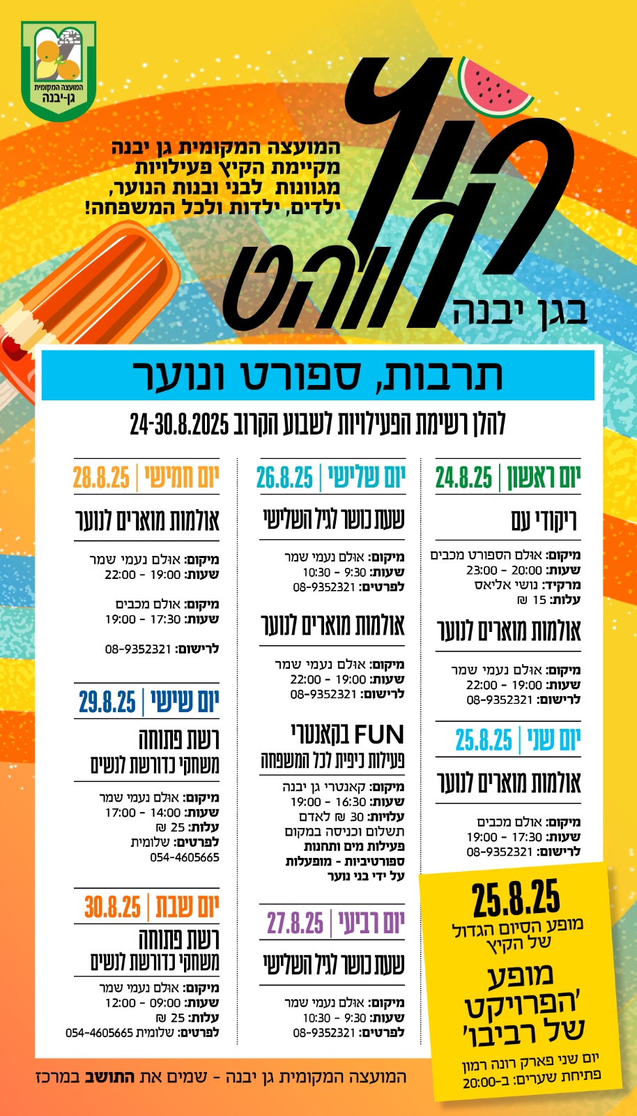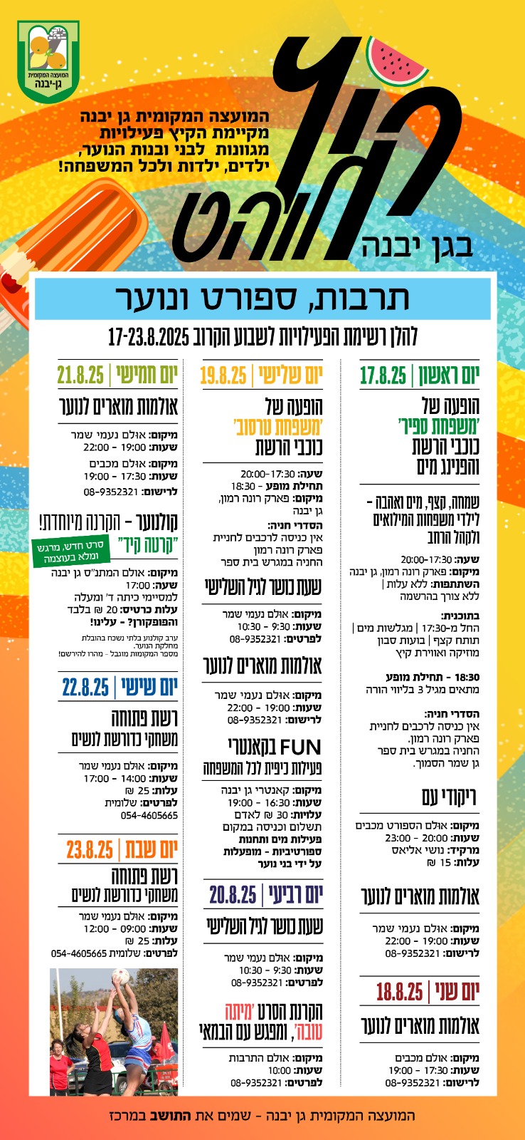 המועצה המקומית בגן יבנה מקיימת שבועיים שלמים של פעילויות קיץ תחת הכותרת "תרבות, ספורט ונוער". התושבים מוזמנים ליהנות ממגוון אירועים חינמיים, מופעים וסדנאות המיועדים לילדים, לנוער ולמבוגרים, בין התאריכים 17 עד 30 באוגוסט.