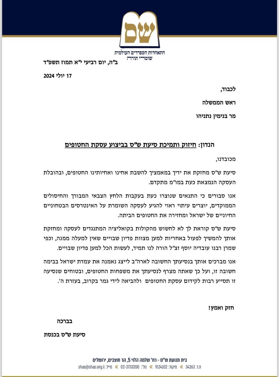 סיעת ש״ס במכתב לראש הממשלה: תומכים ומחזקים אותך במאמציך להשלים את עסקת החטופים.