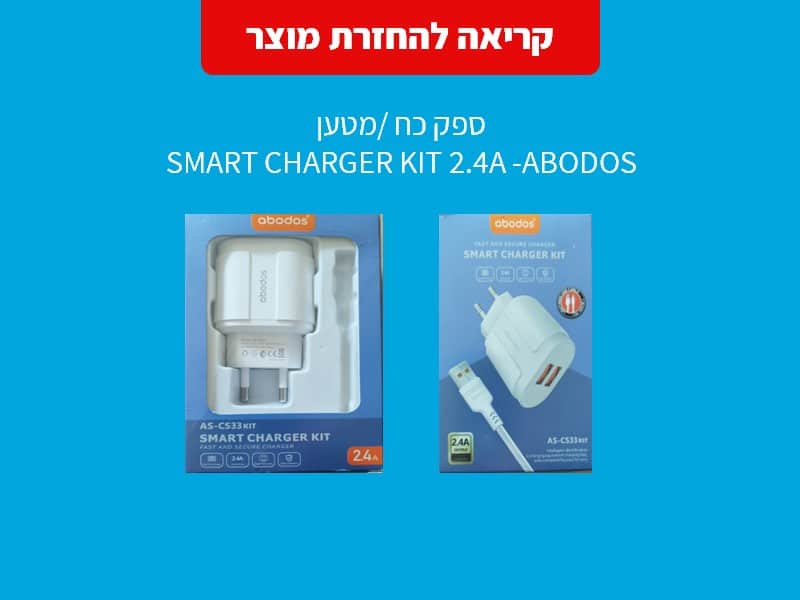 חשש להתלקחות ותהחשמלות: חברת "אשר פתרונות טכנולוגיים (טקליין) בע"מ" ח.פ. 515516896 קוראת לציבור להפסיק את השימוש מיידית במוצר שיובא על ידה – ספק כח /מטען: SMART CHARGER KIT 2.4A -ABODOS AS-CS33.