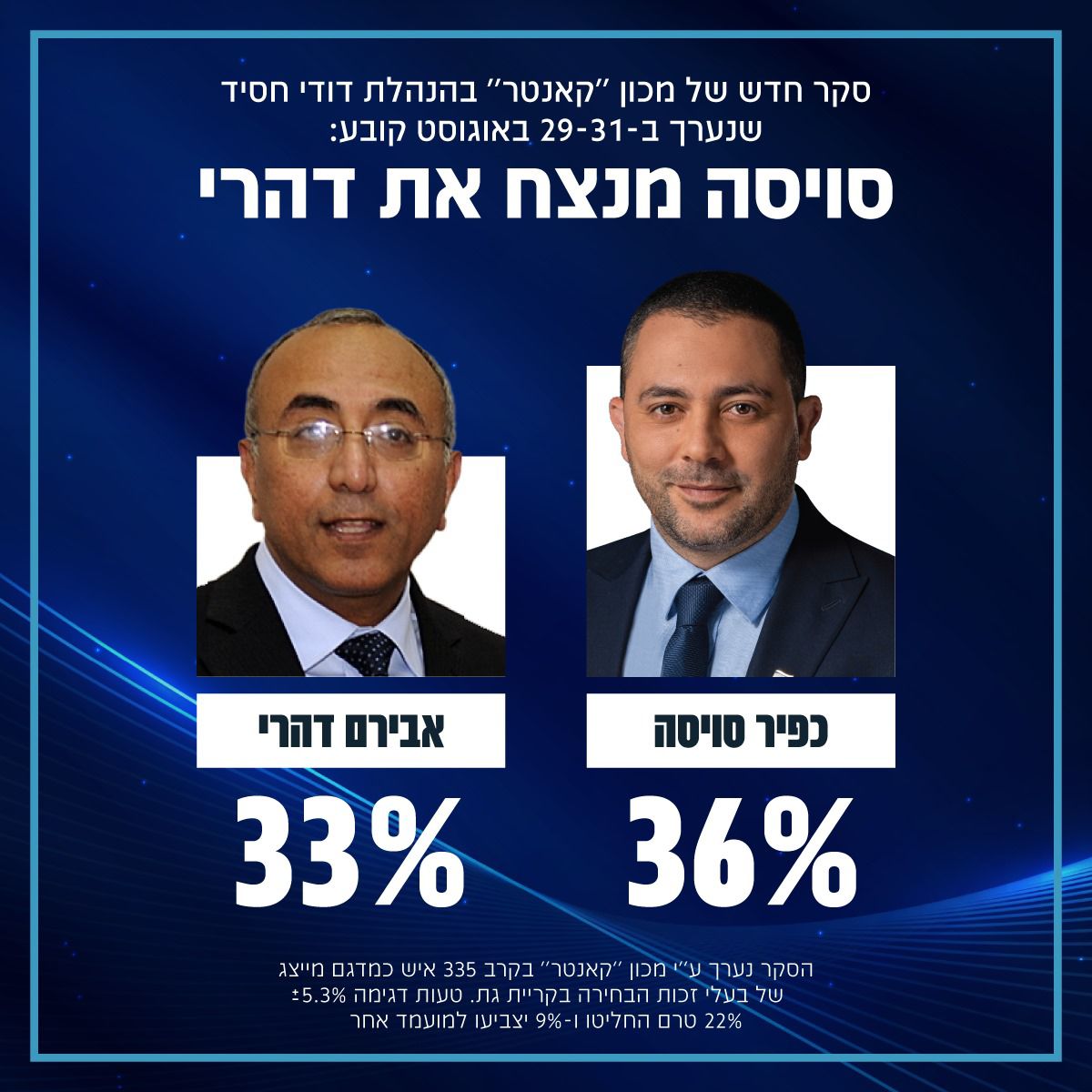 סקר חדש שנערך ע׳׳י מכון ׳׳קאנטר׳׳ בהנהלת דודי חסיד קובע: כפיר סויסה מנכ׳׳ל משרד התרבות והספורט לשעבר, מנצח את ראש העיר הנוכחי אבירם דהרי בהתמודדות ראש בראש.