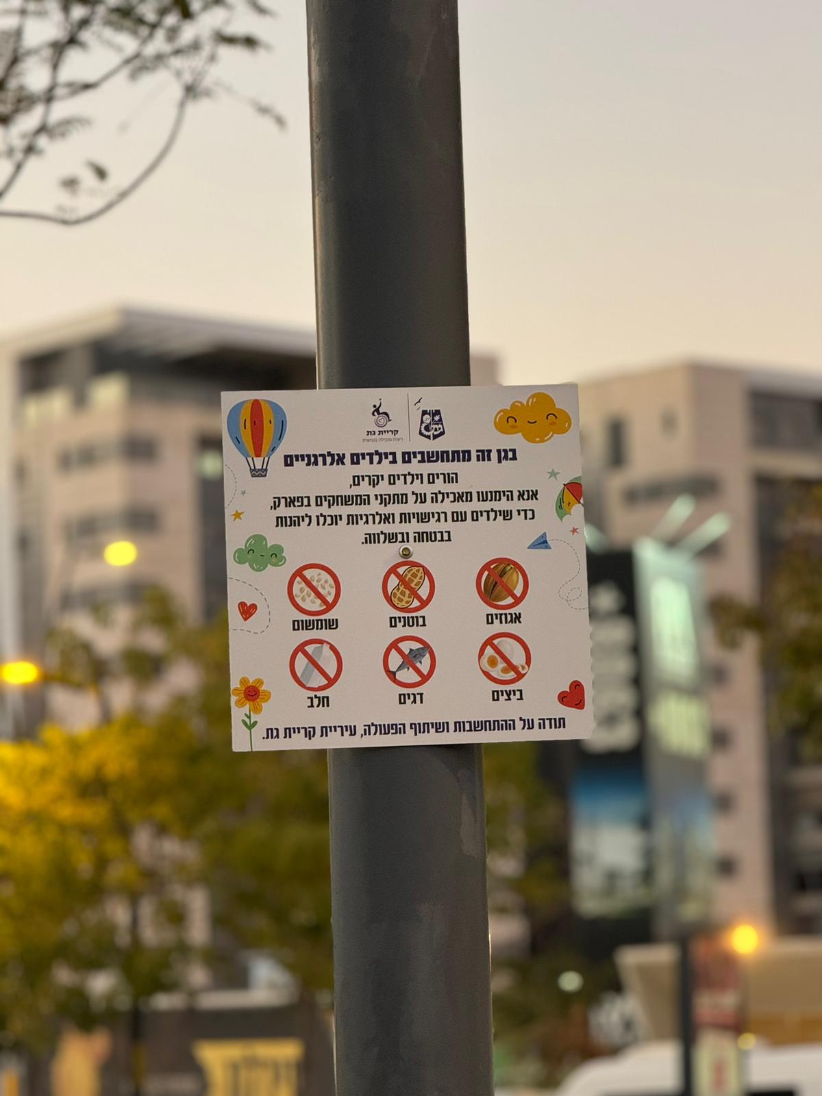 לפי עיריית קריית גת, "התקנת השלטים מגיעה בעקבות פניות של הורים שציינו את החשש מהמזון (חטיפים, כריכים מסוימים או ממתקים), שמסיבות רפואיות עלול להוות סכנה לילדיהם הסובלים מאלרגיות שונות. השלטים מציינים את המזון המסוכן כמו אגוזים, חלב, בוטנים, שומשום, ביצים ודגים העלולים לגרום לתגובה אלרגית חמורה ולעיתים אף לסכן חיים.
